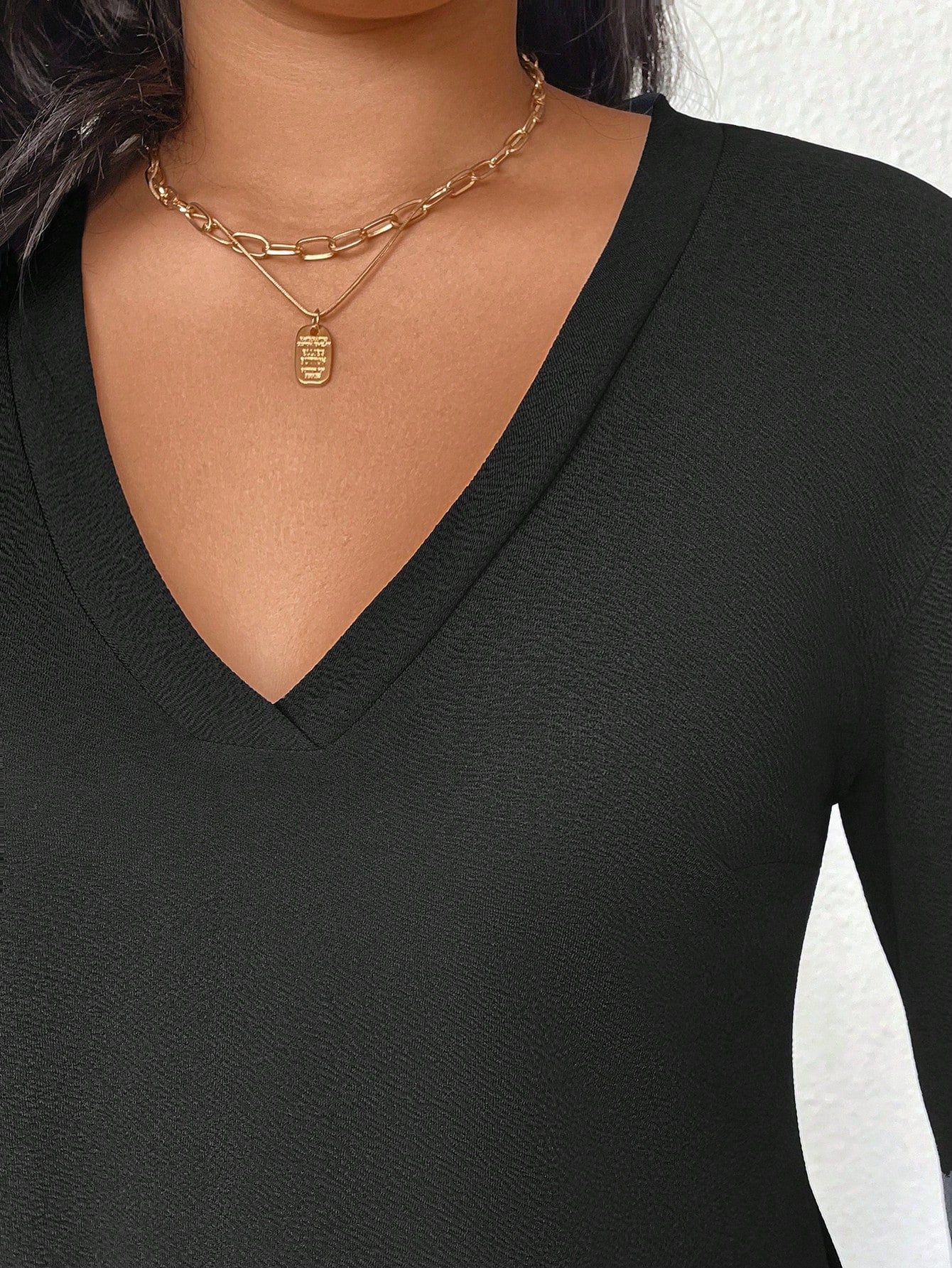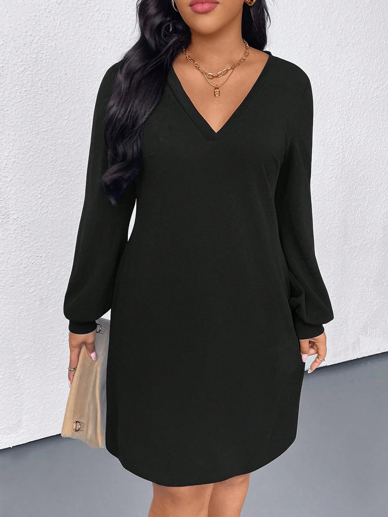 Abito casual elegante nero da donna con scollo a V profondo, maniche a lanterna a sbuffo, dritto