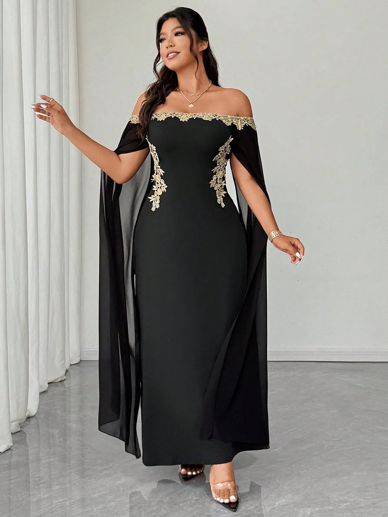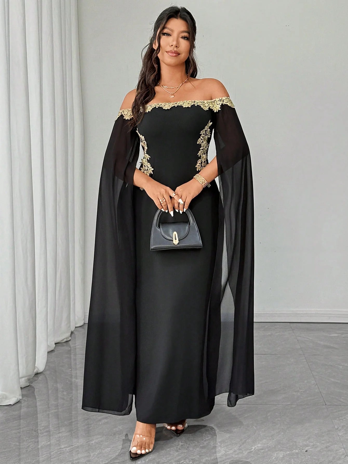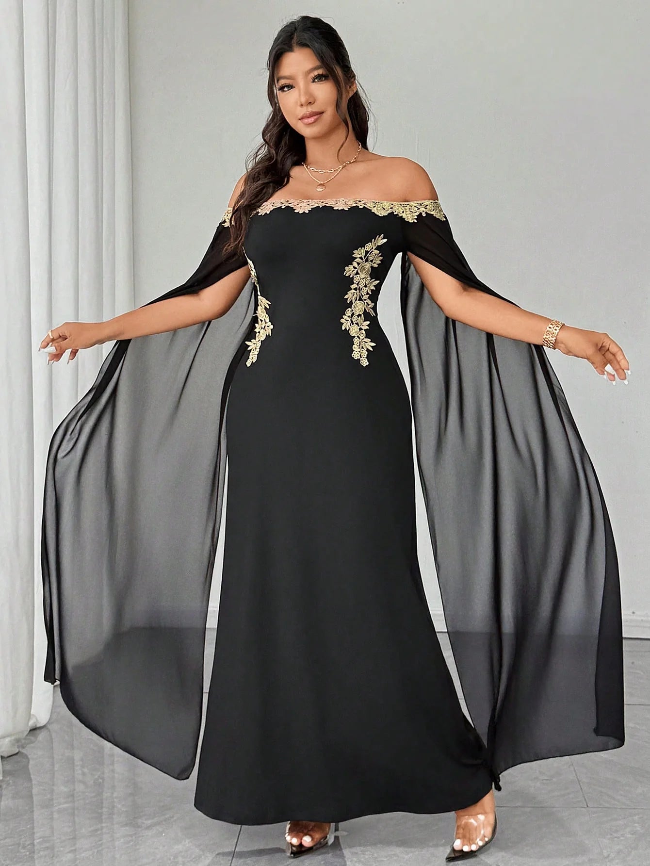 Abito in rete con applicazioni floreali dorate, elegante