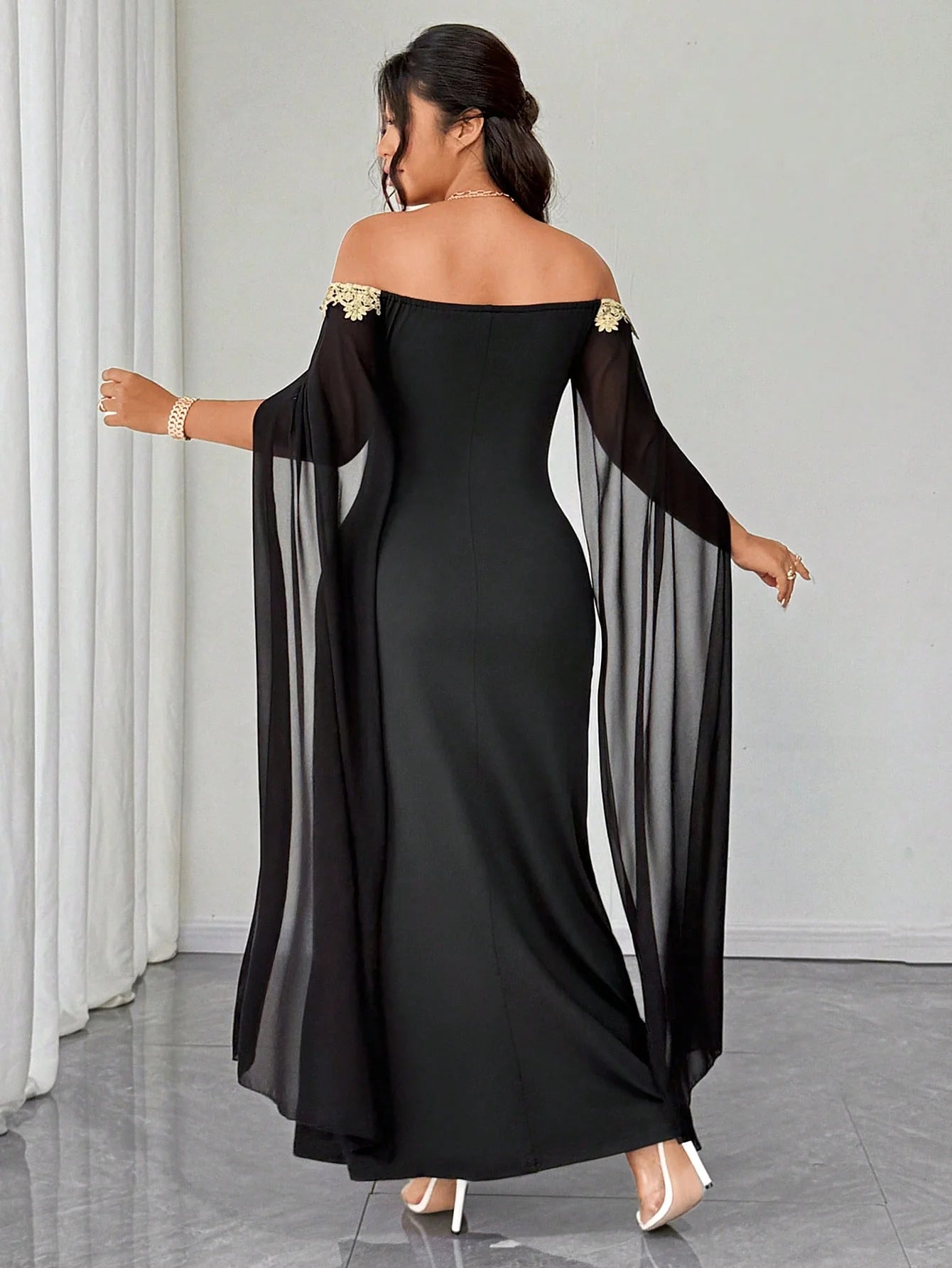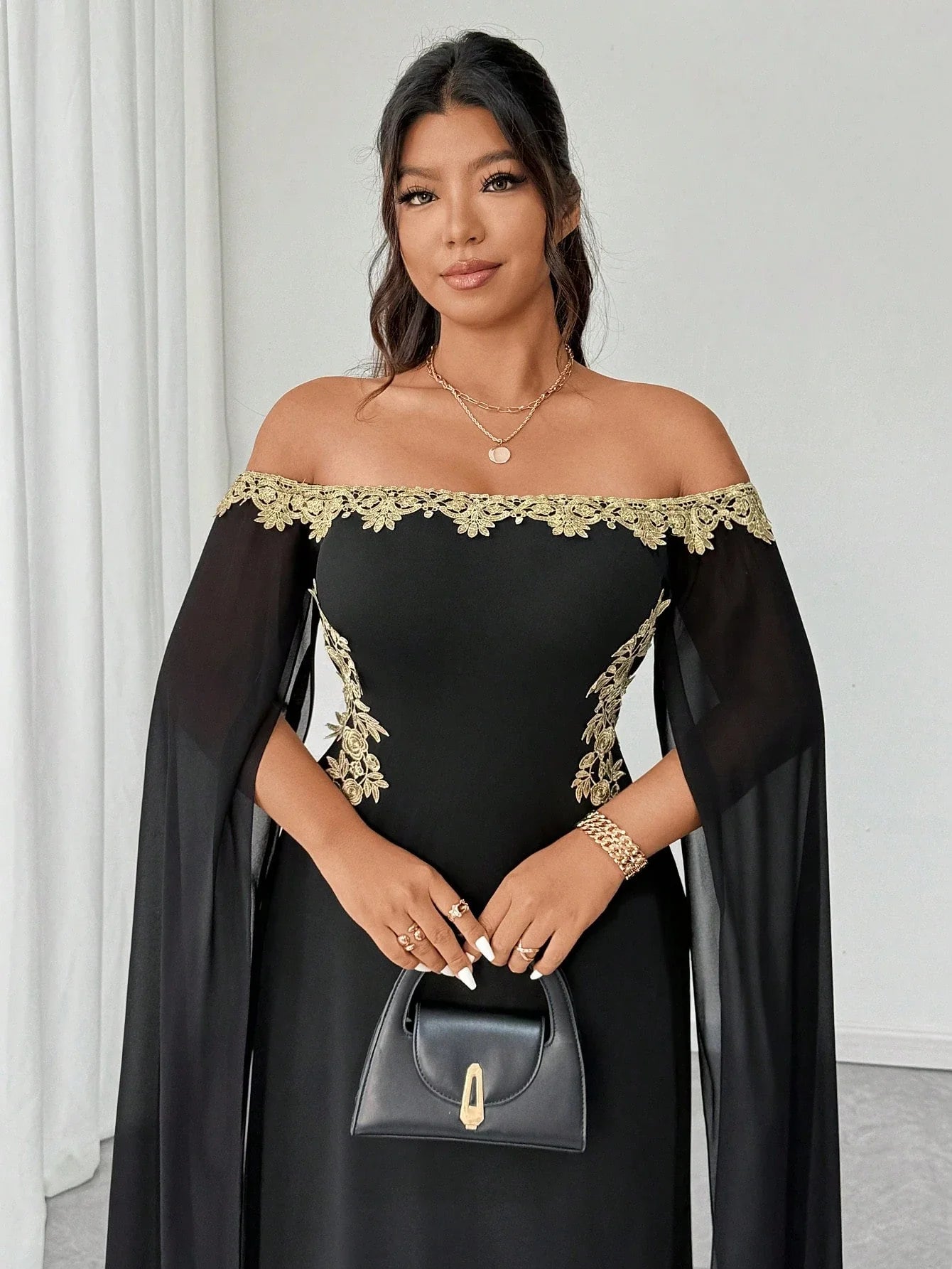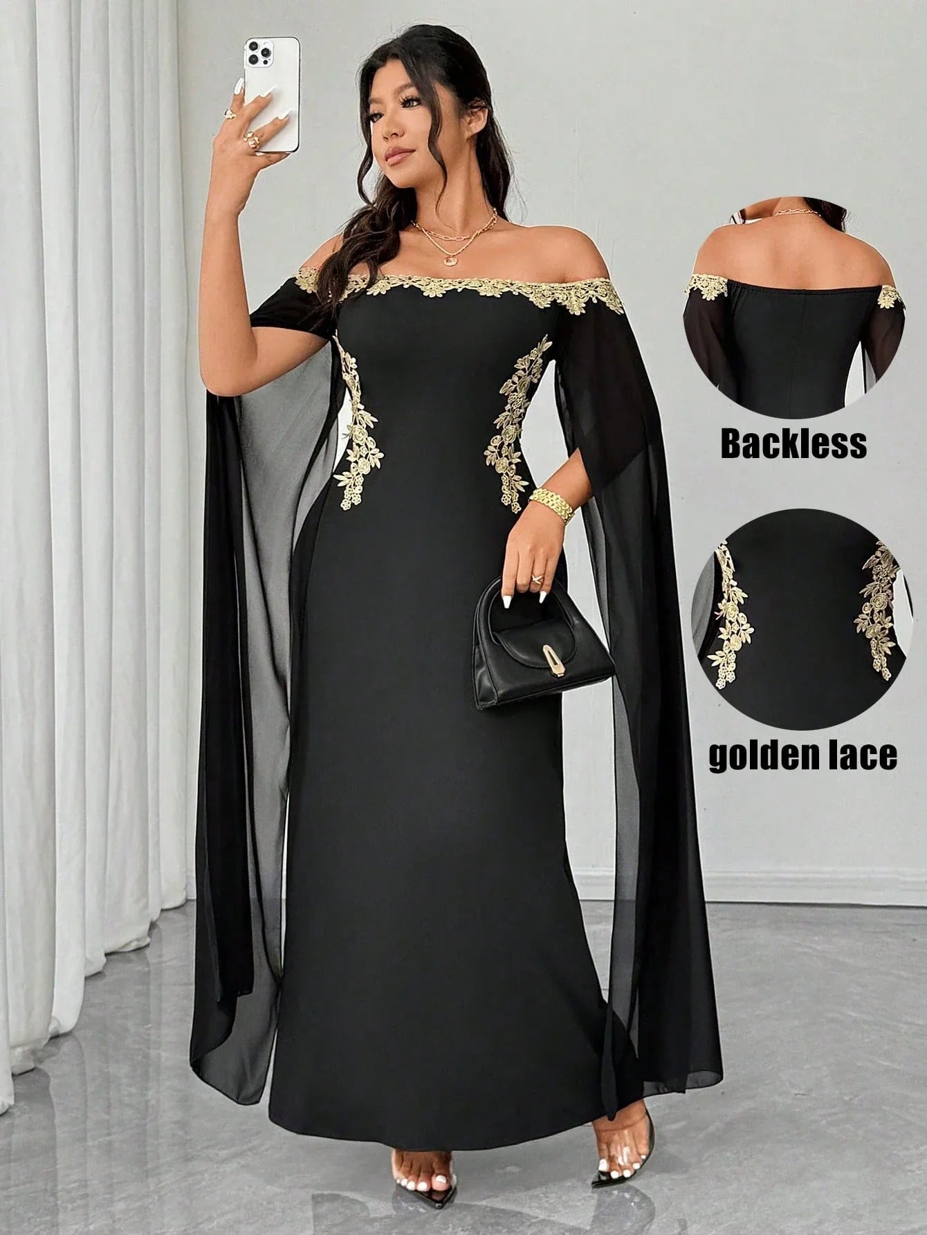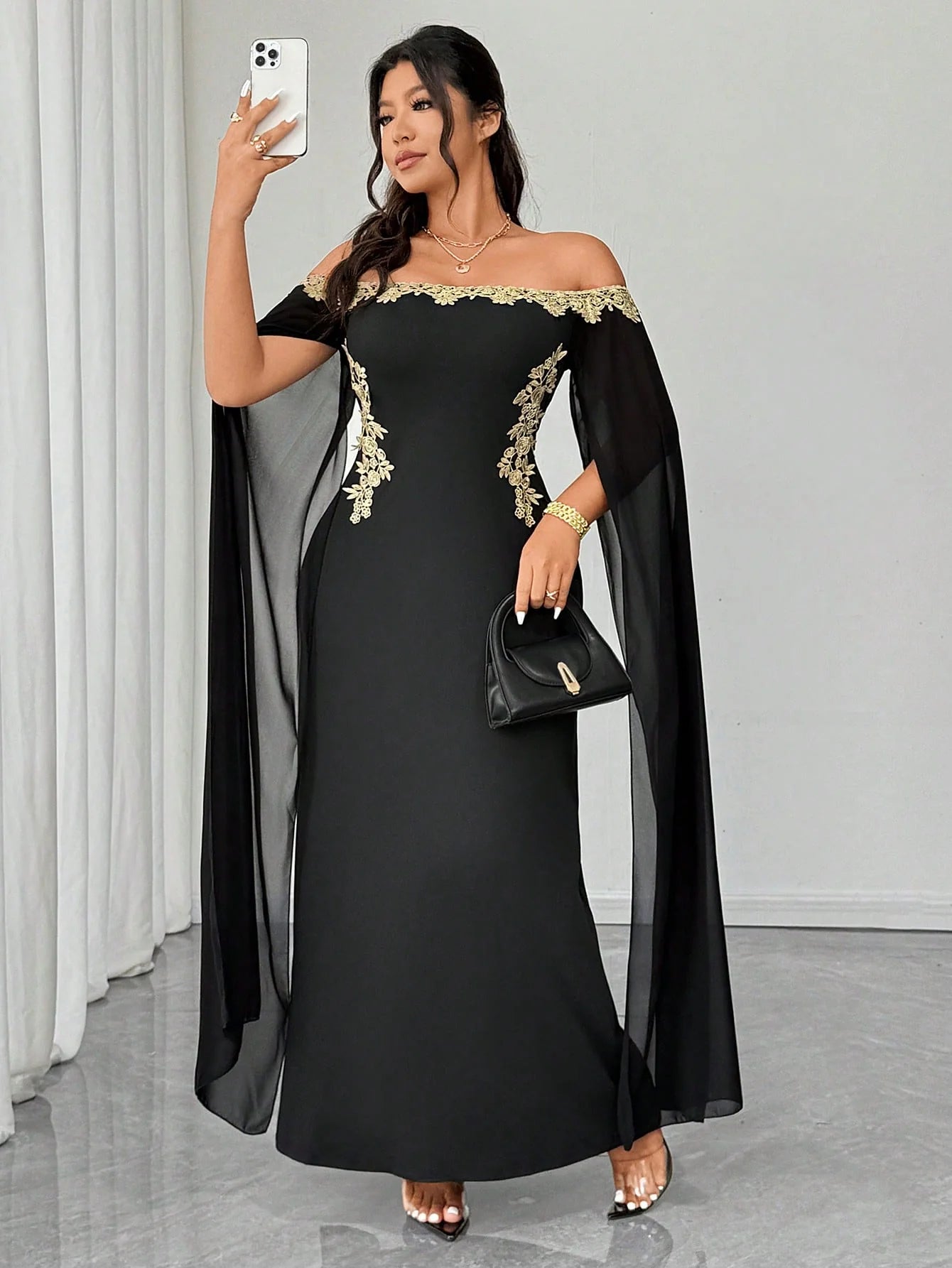 Abito in rete con applicazioni floreali dorate, elegante