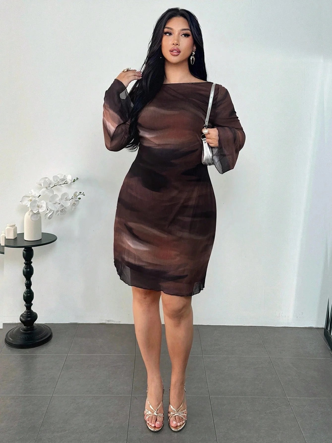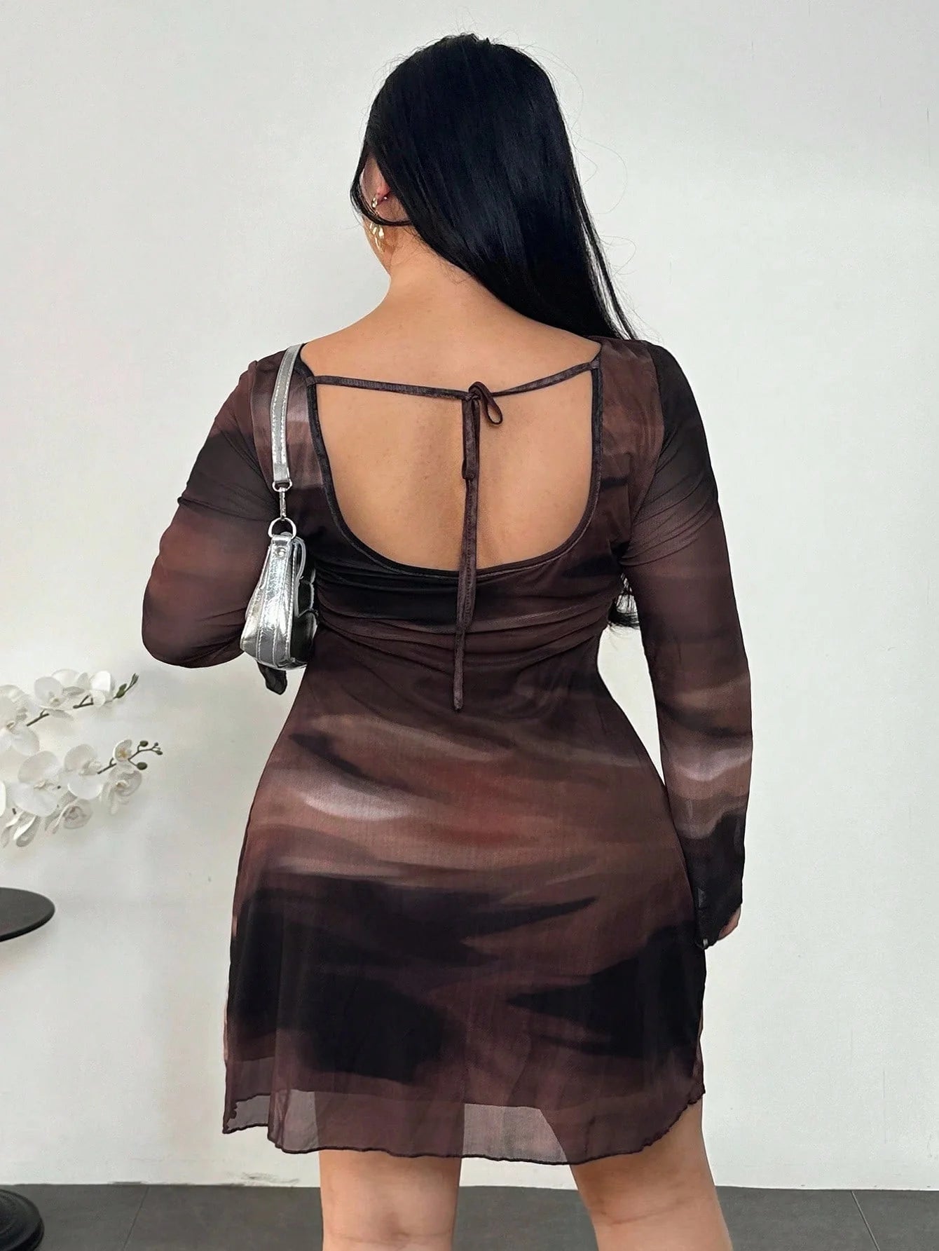 Abito mini in rete e trasparente con maniche a campana, senza schienale, con stampa sfumata