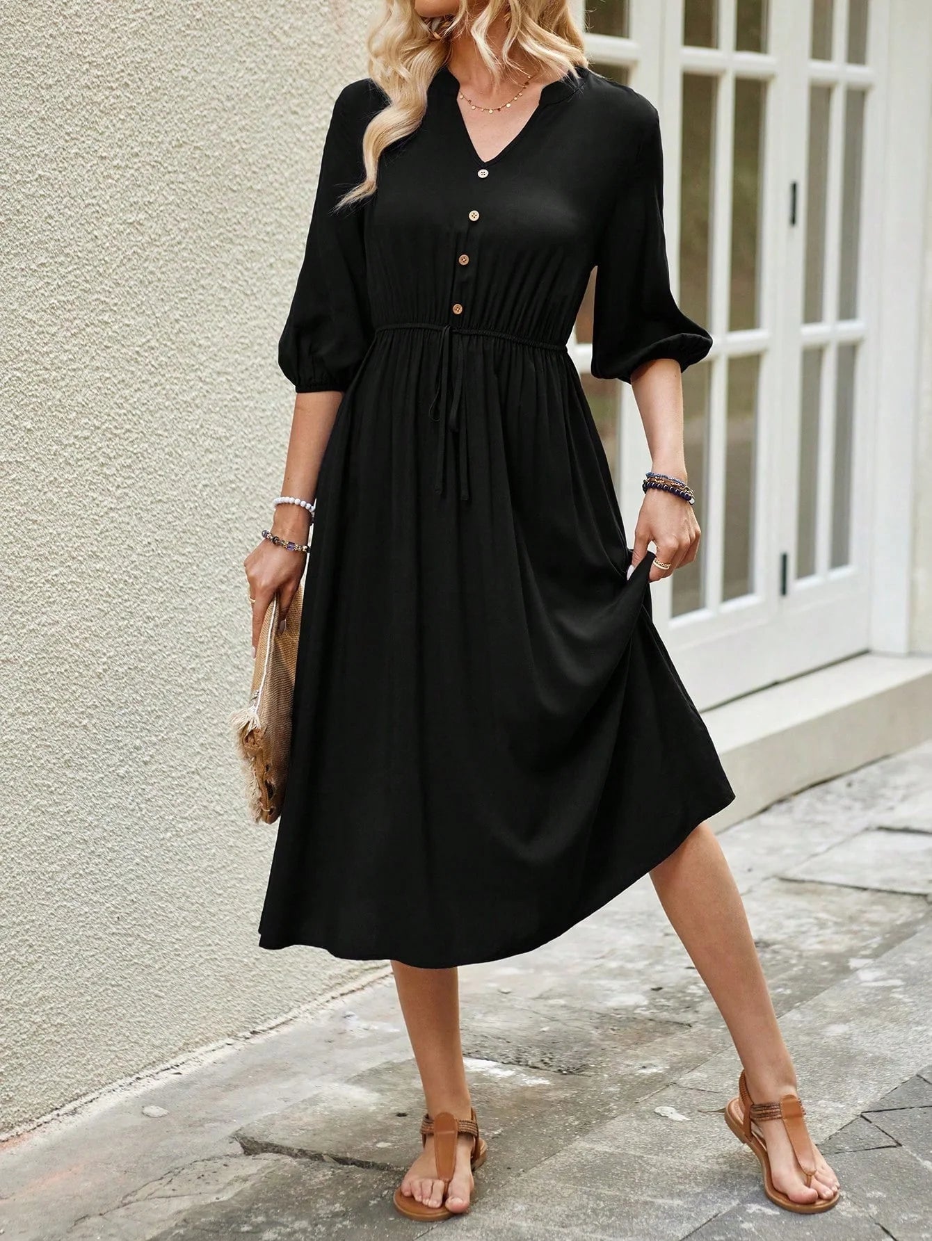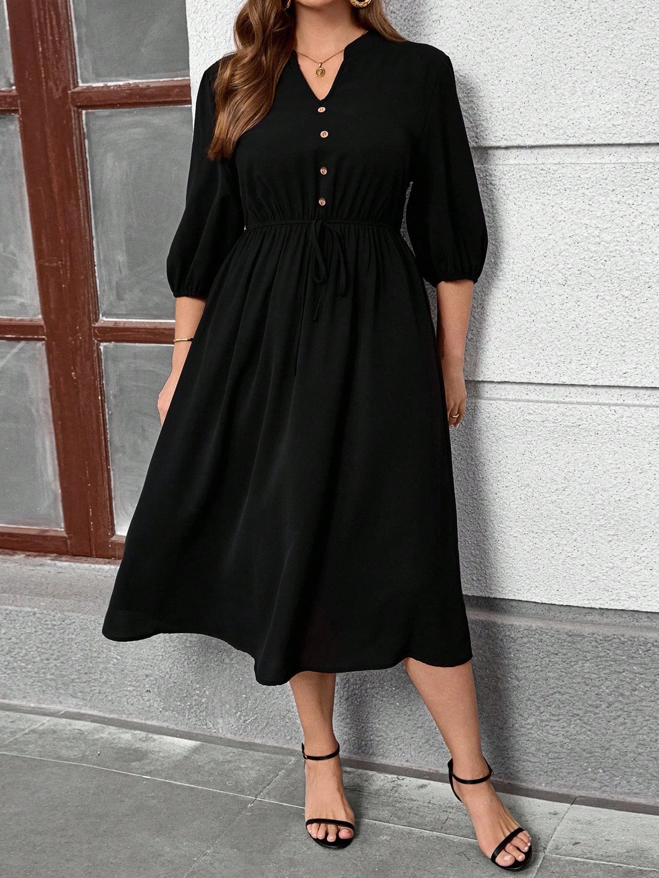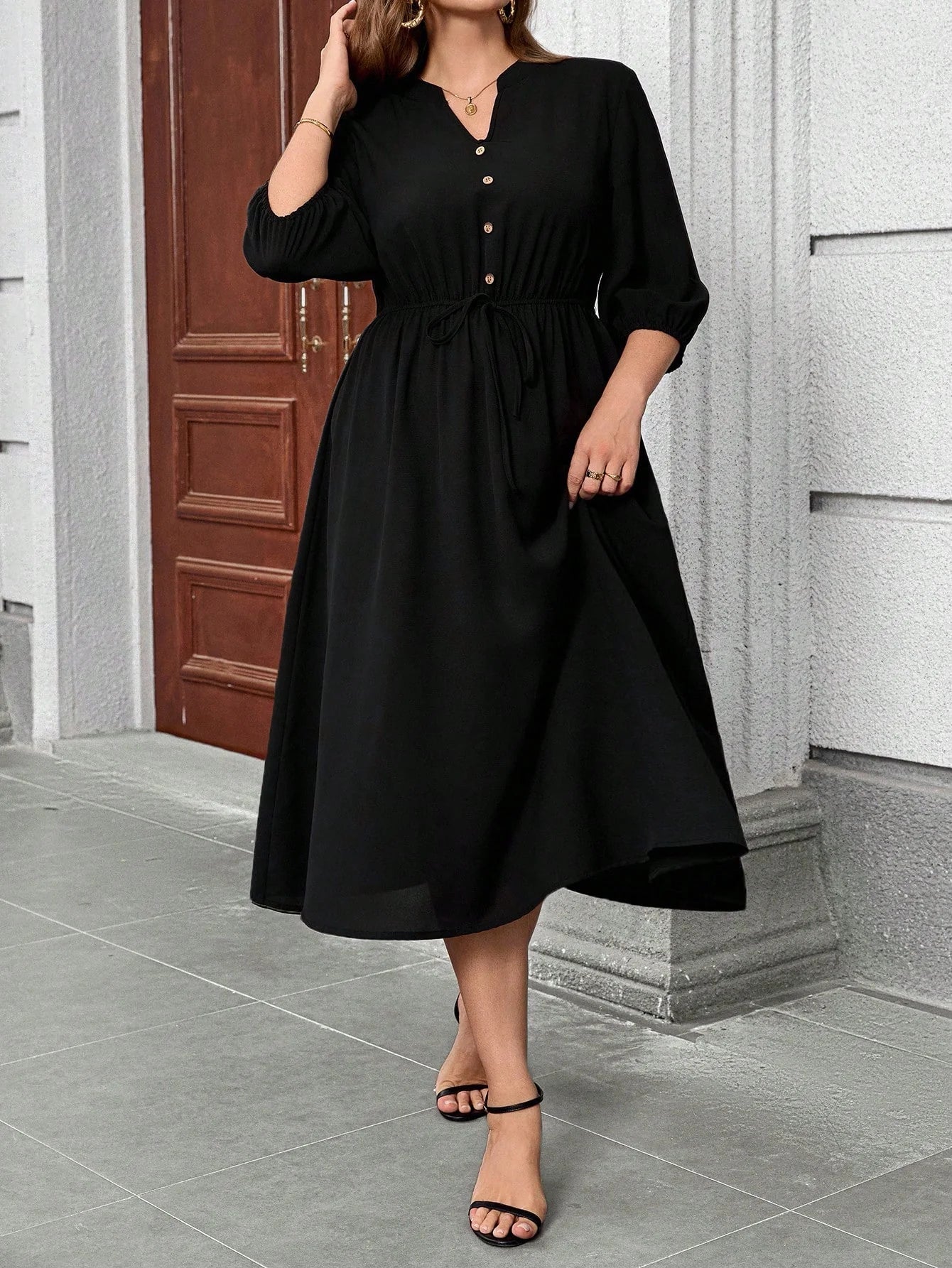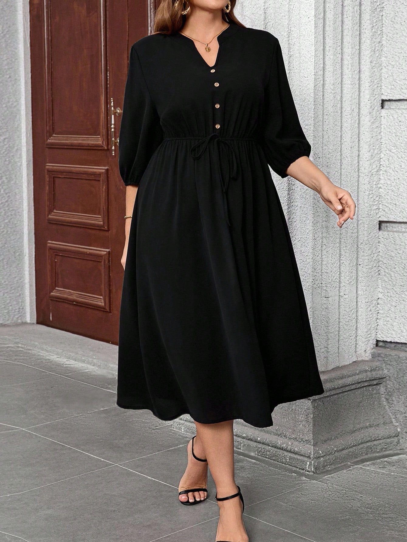 Vestito a-line con scollo a v e maniche a palloncino, adatto per taglie curvy, che nasconde il ventre