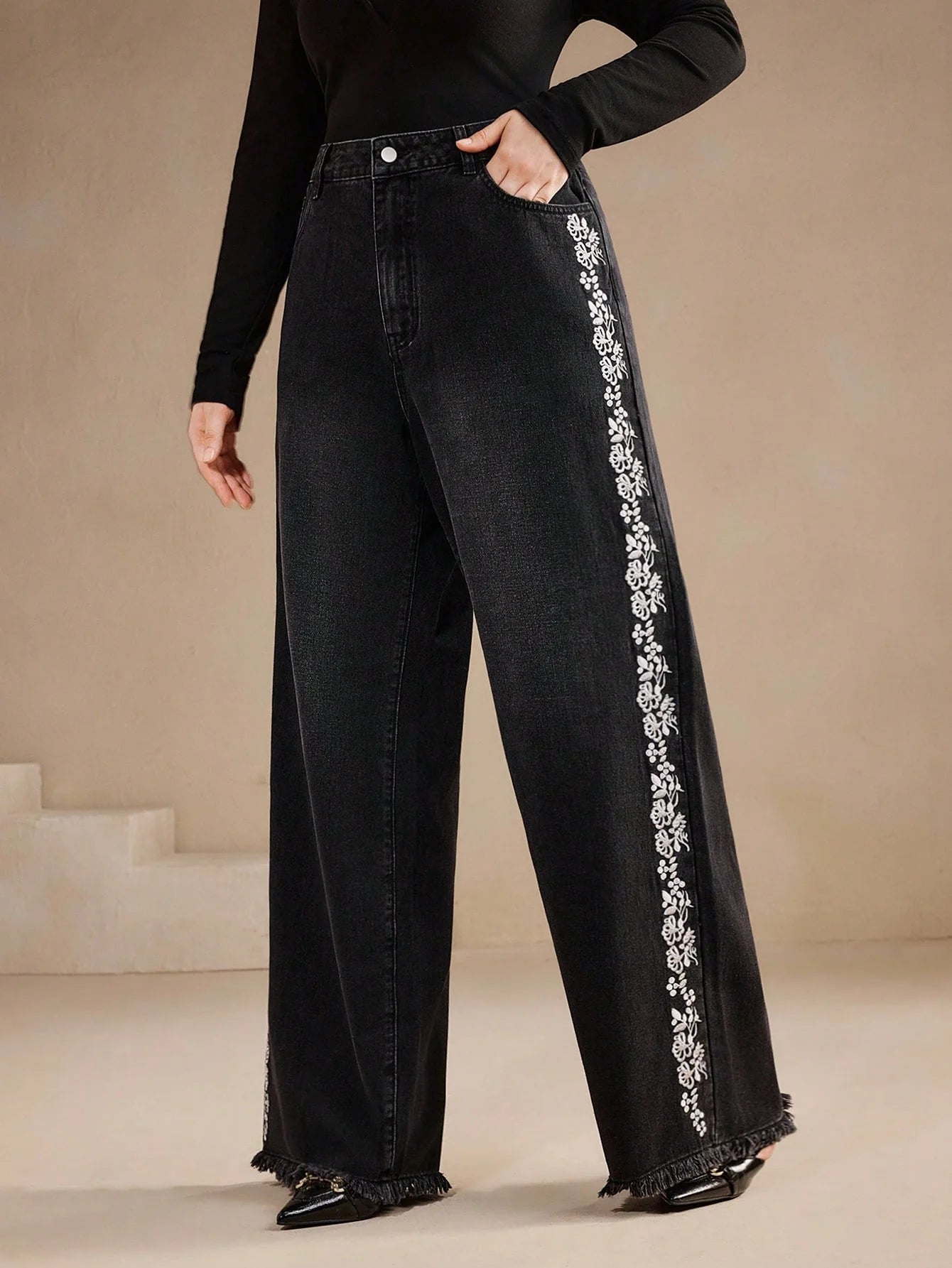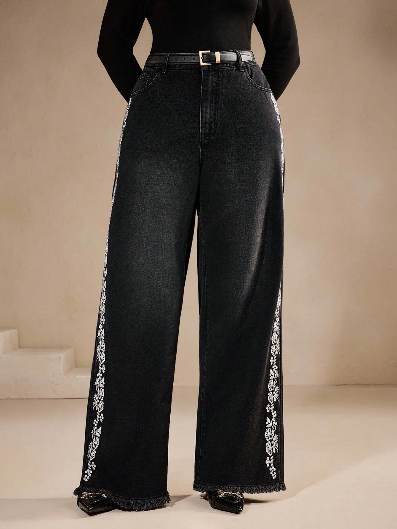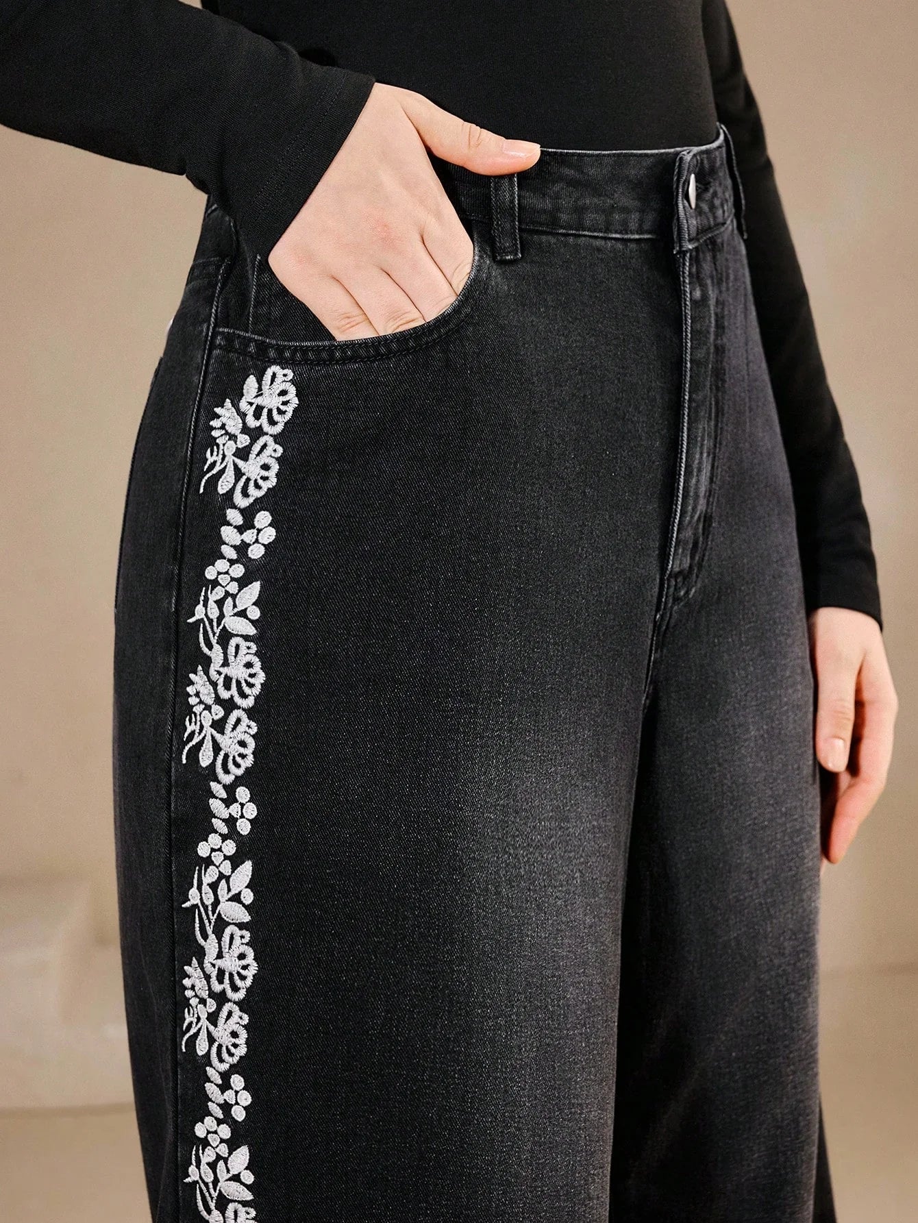 Jeans dritti neri eleganti da donna con ricami e lavorazione traforata