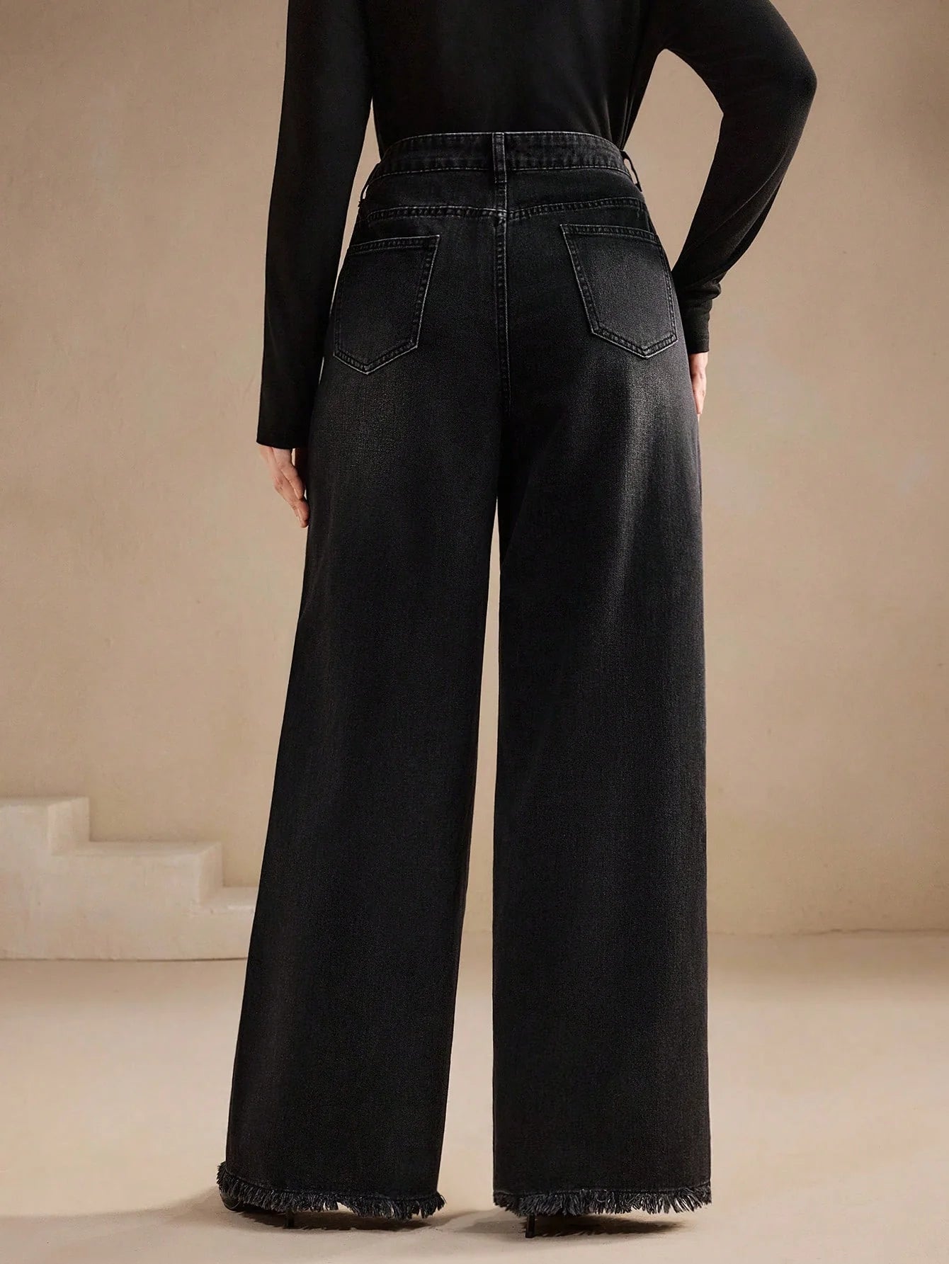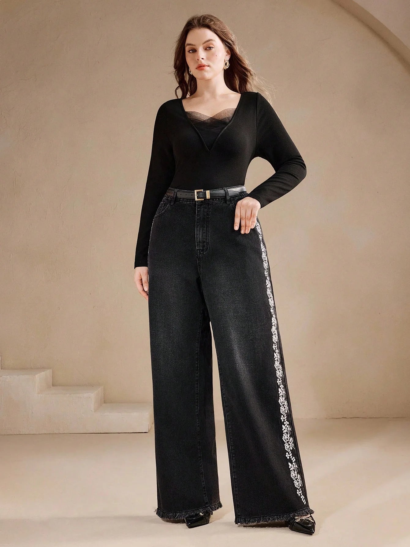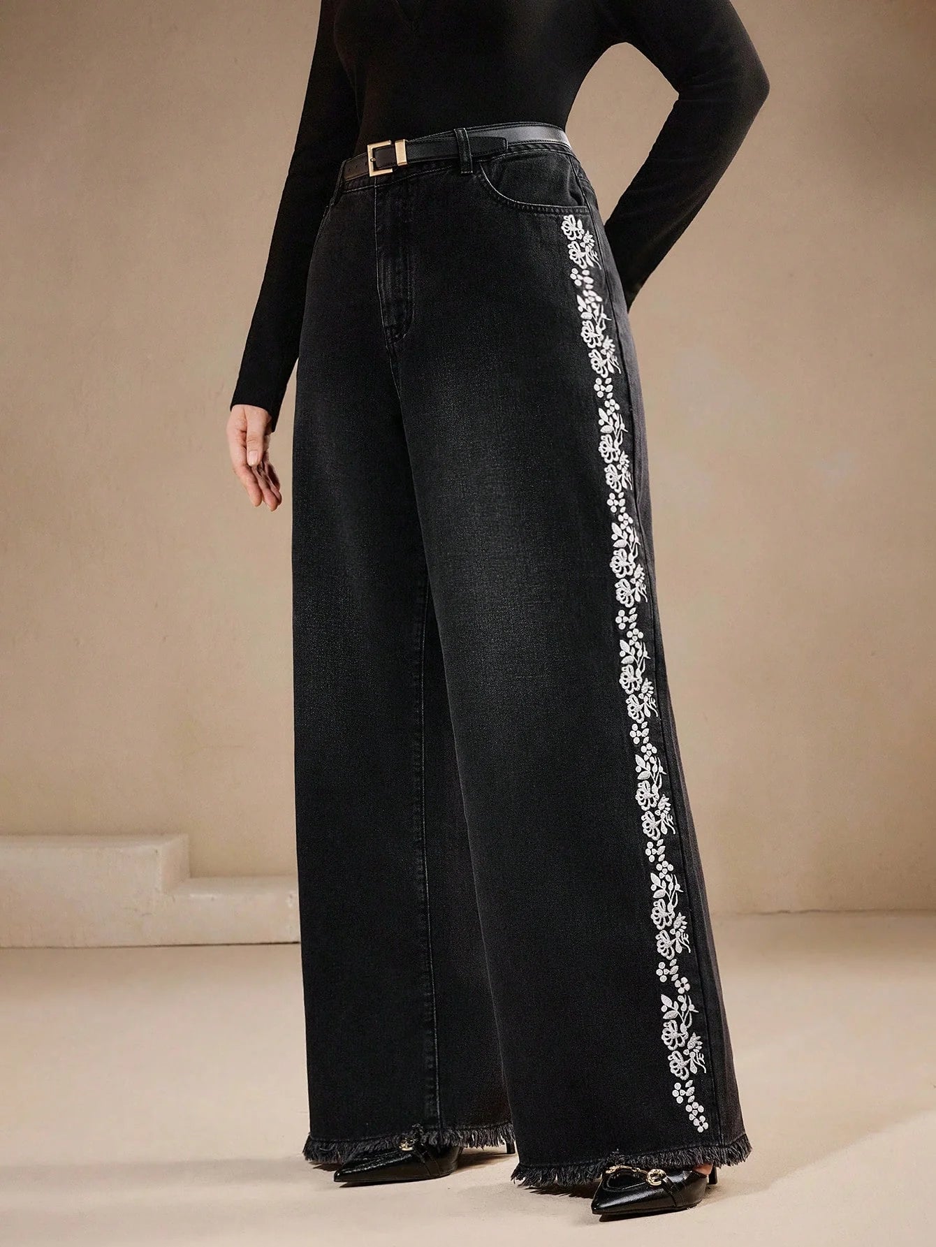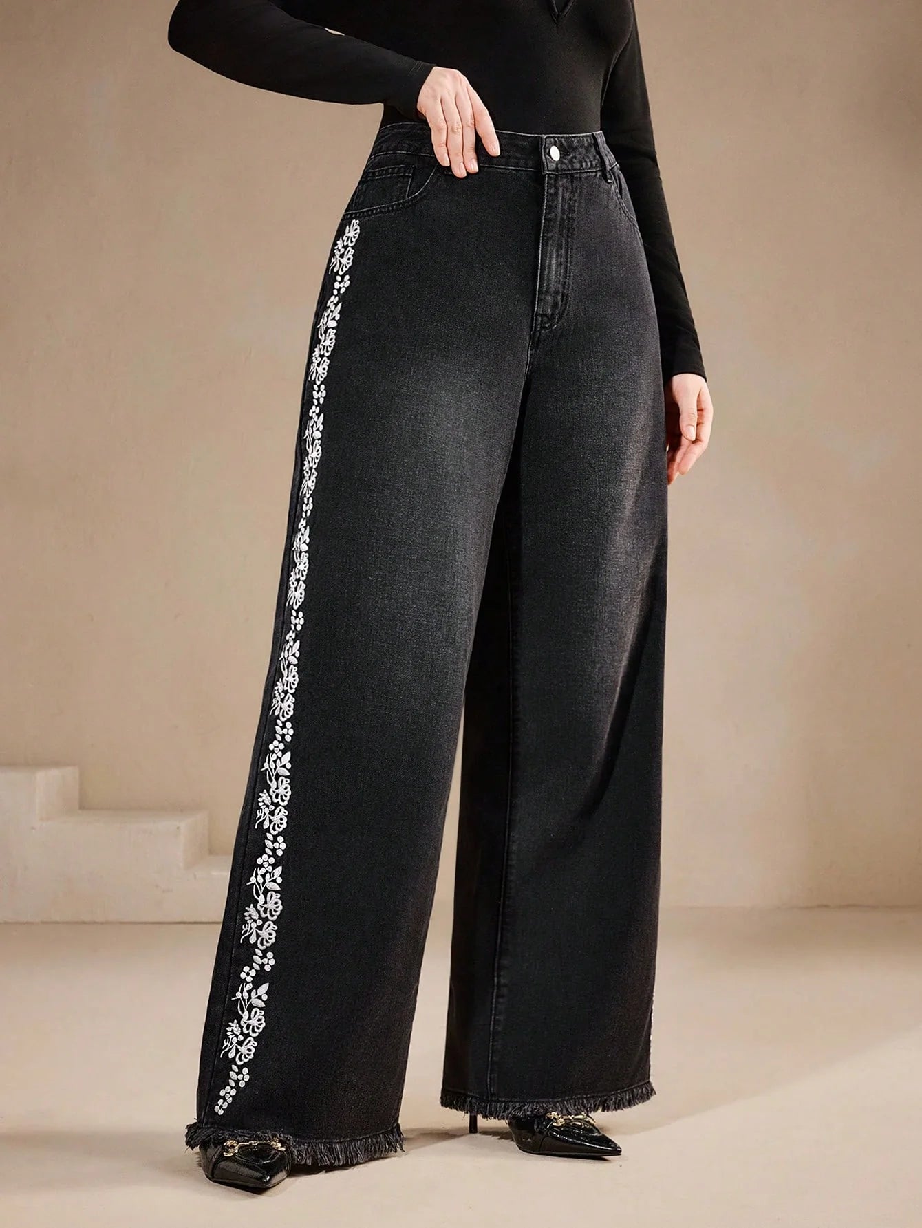Jeans dritti neri eleganti da donna con ricami e lavorazione traforata