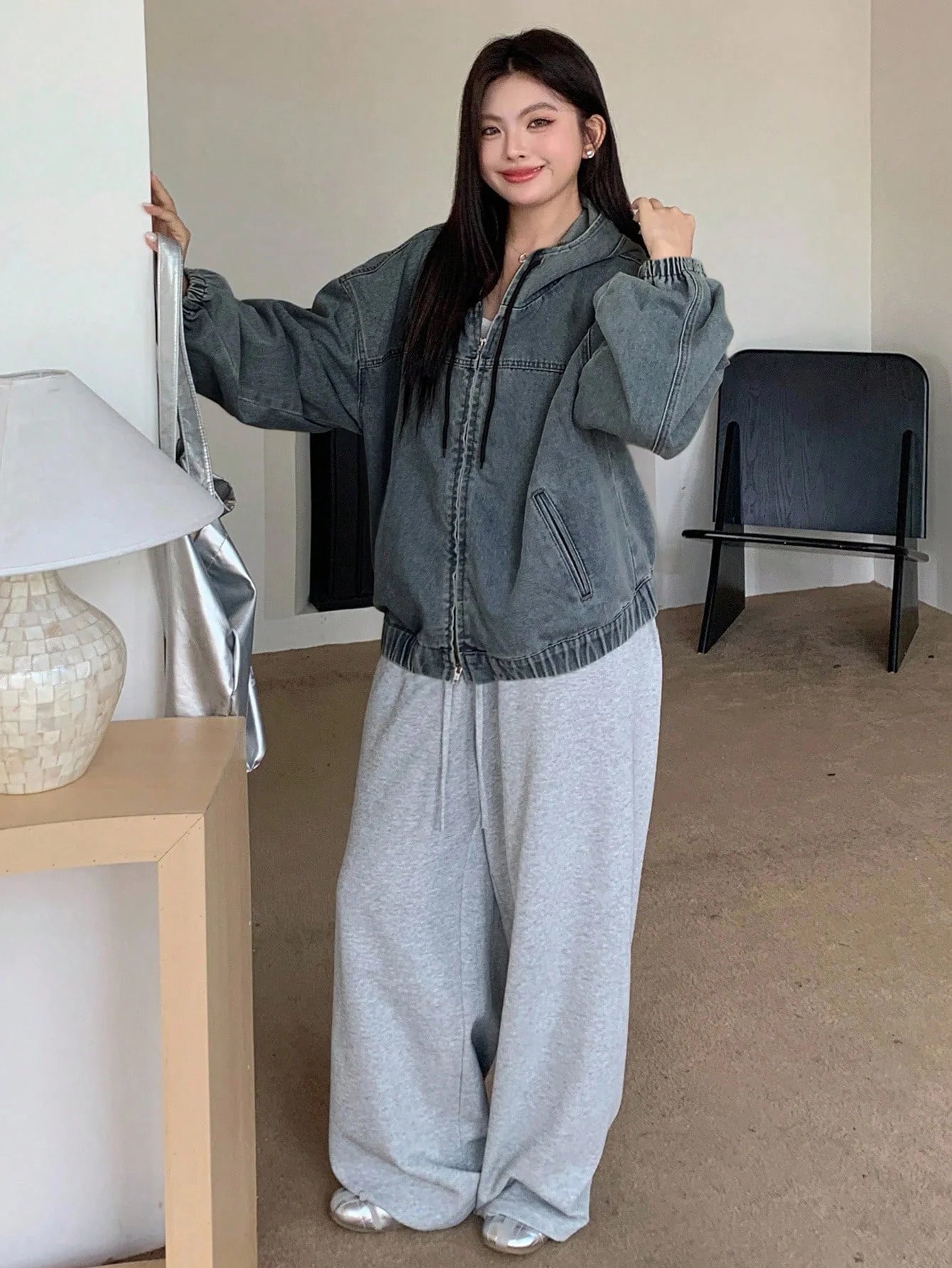 Giacca di jeans lavaggio chiaro oversize da donna, con cappucciochiusura lampoip, maniche a lanterna larghe, orlo con coulisse, casual