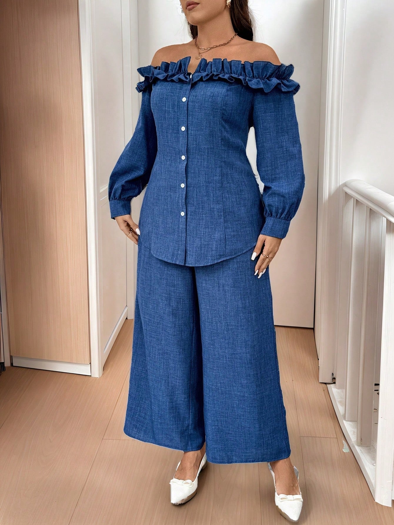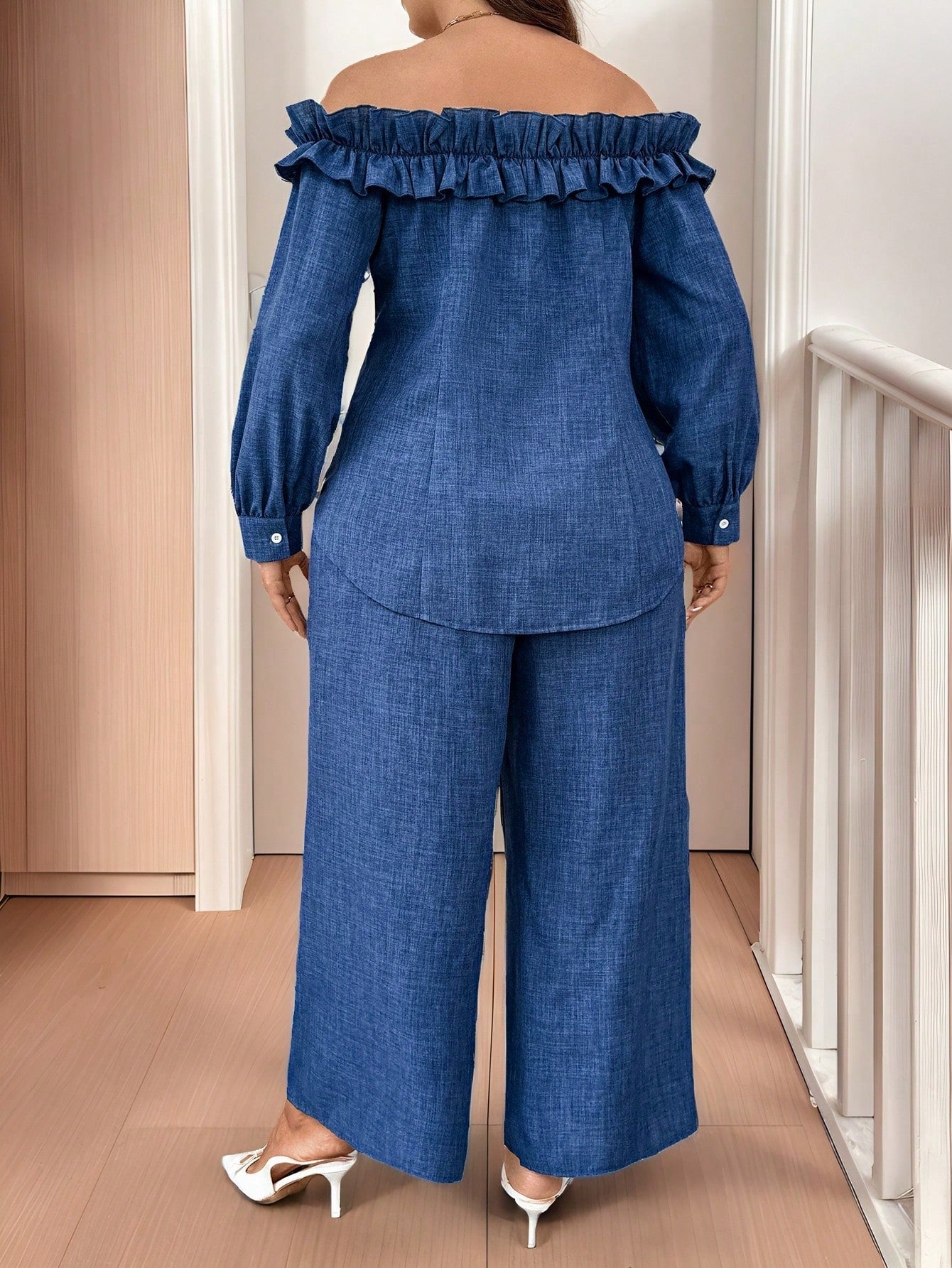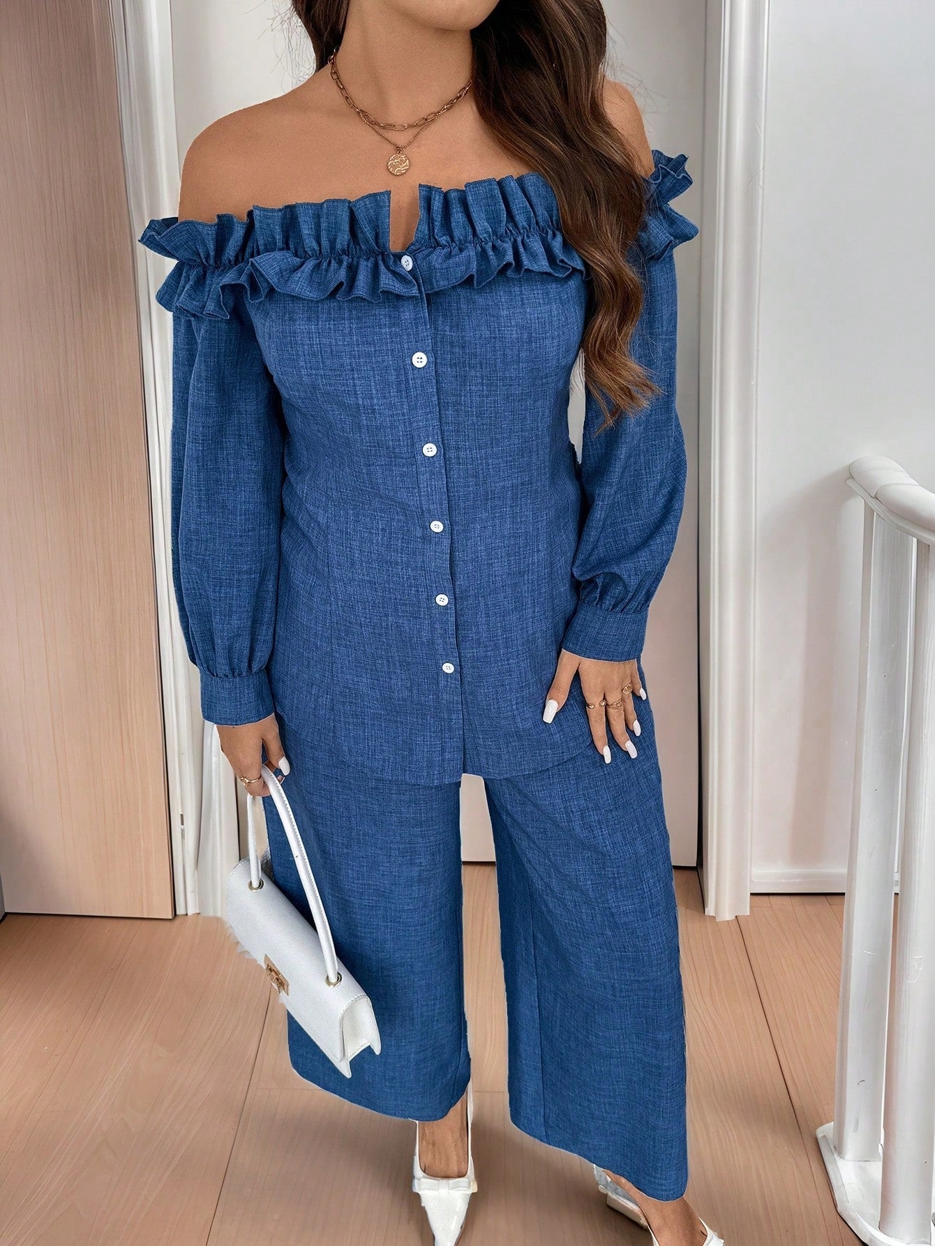 Set da 2 pezzi, composto da top a spalle scoperte con volant e maniche lunghe, apertura anteriore e posteriore, e pantaloni a vita alta dritti, realizzato in un tessuto non di jeans