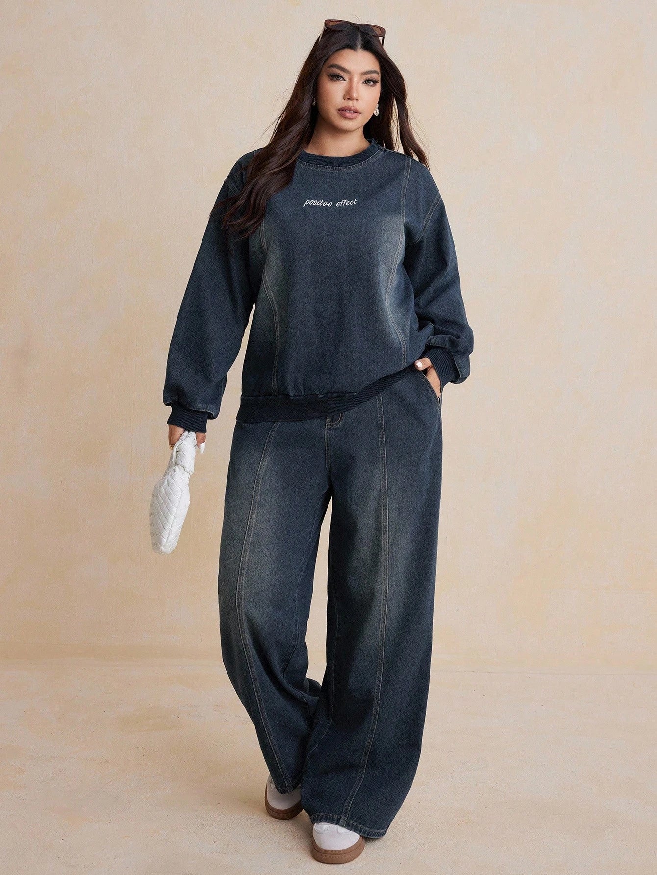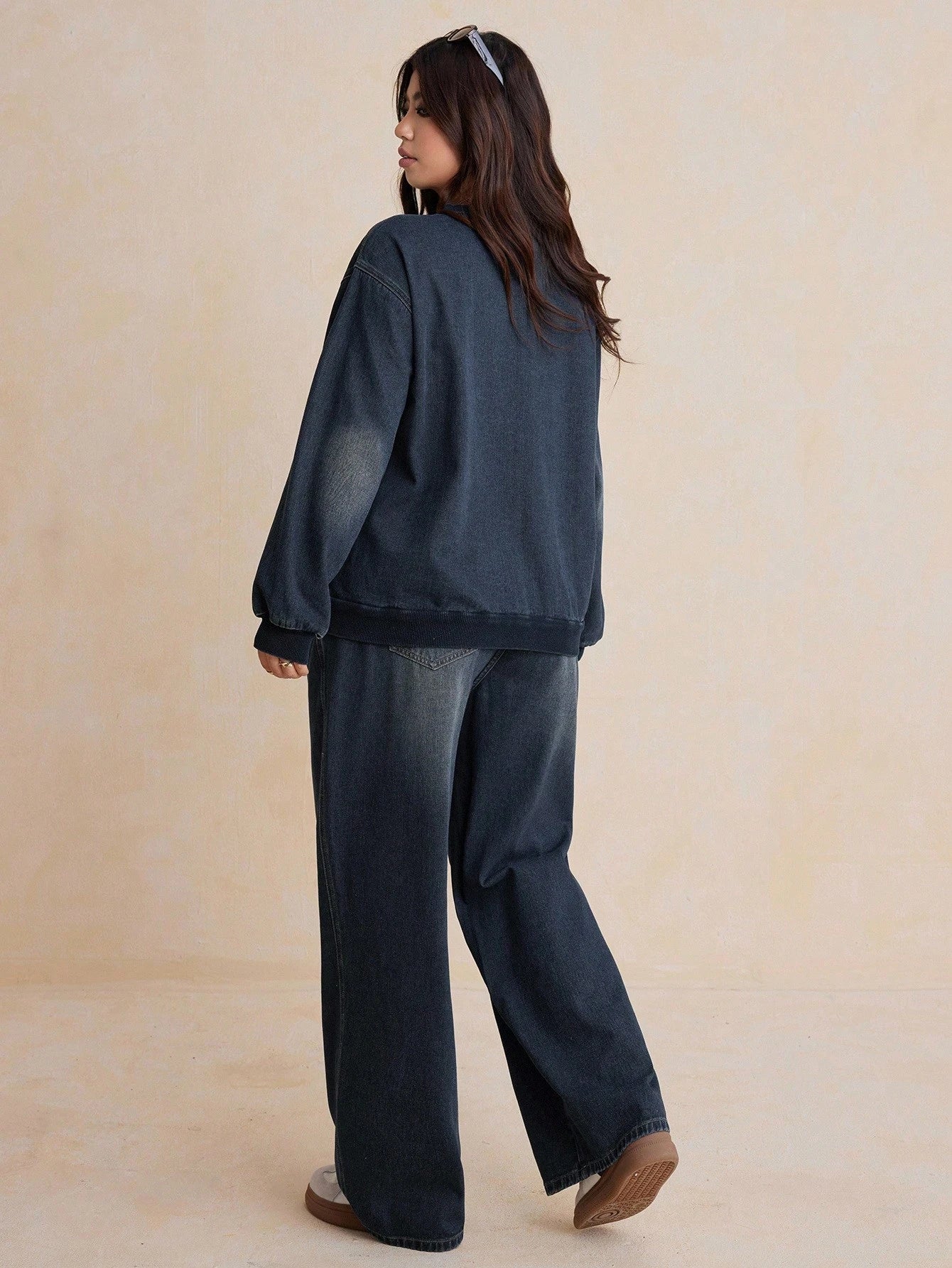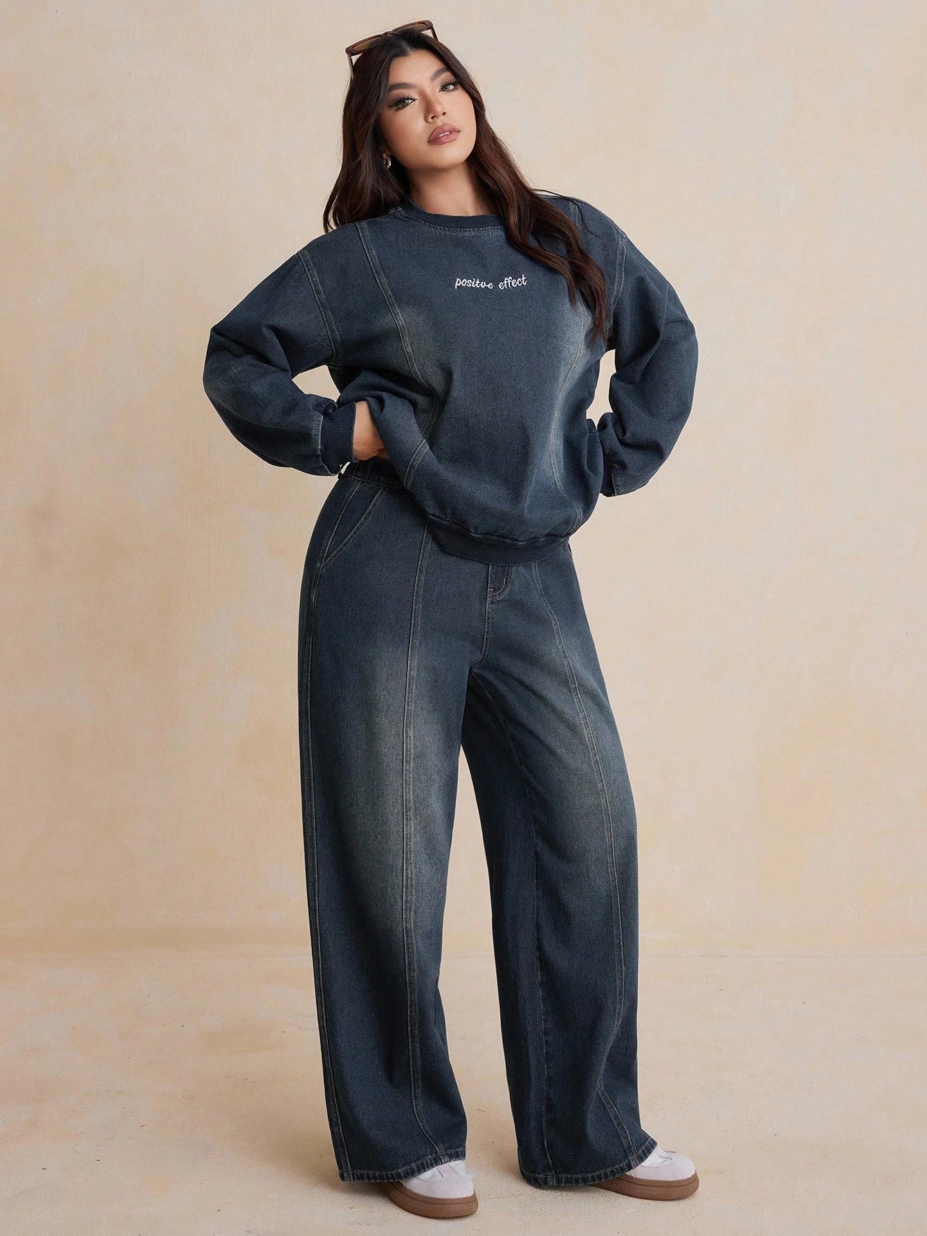 Set di top e pantaloni in denim blu scuro lavato con ricamo a lettere, oversize