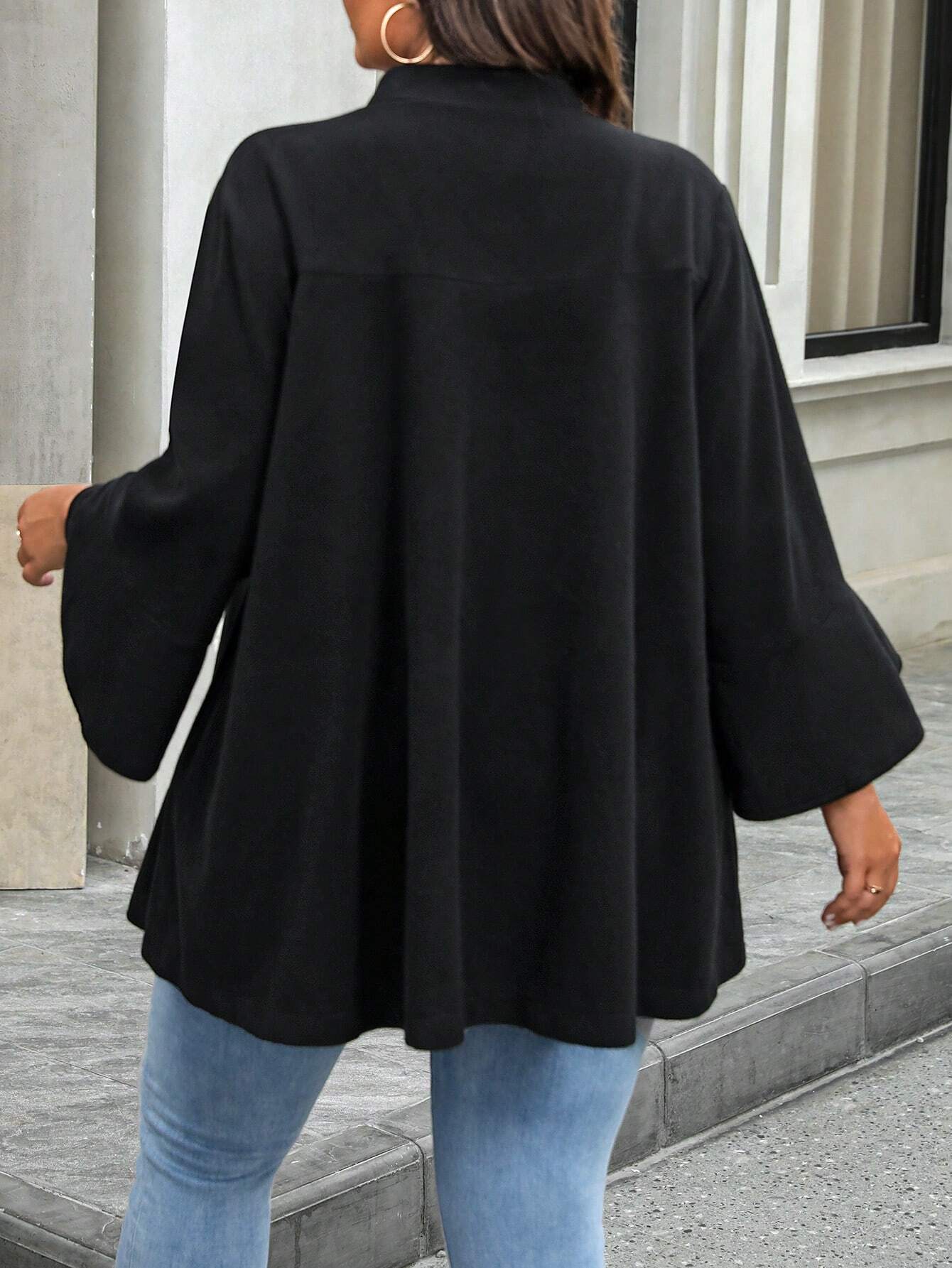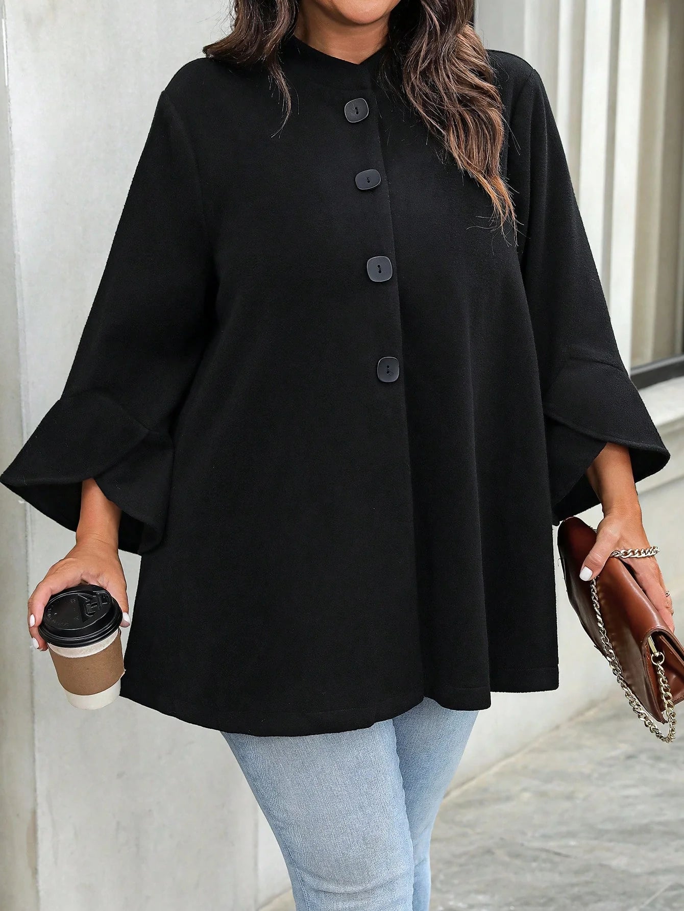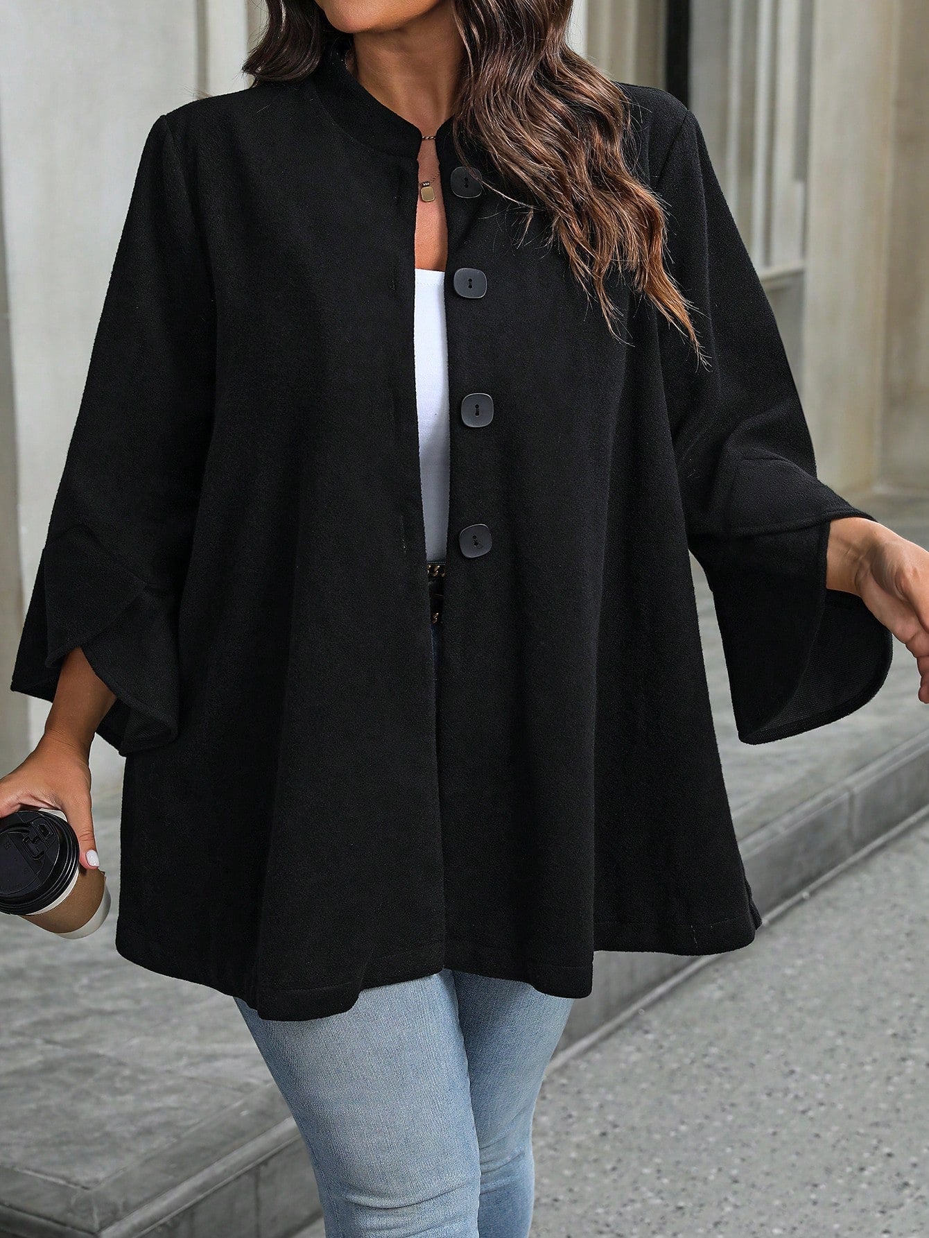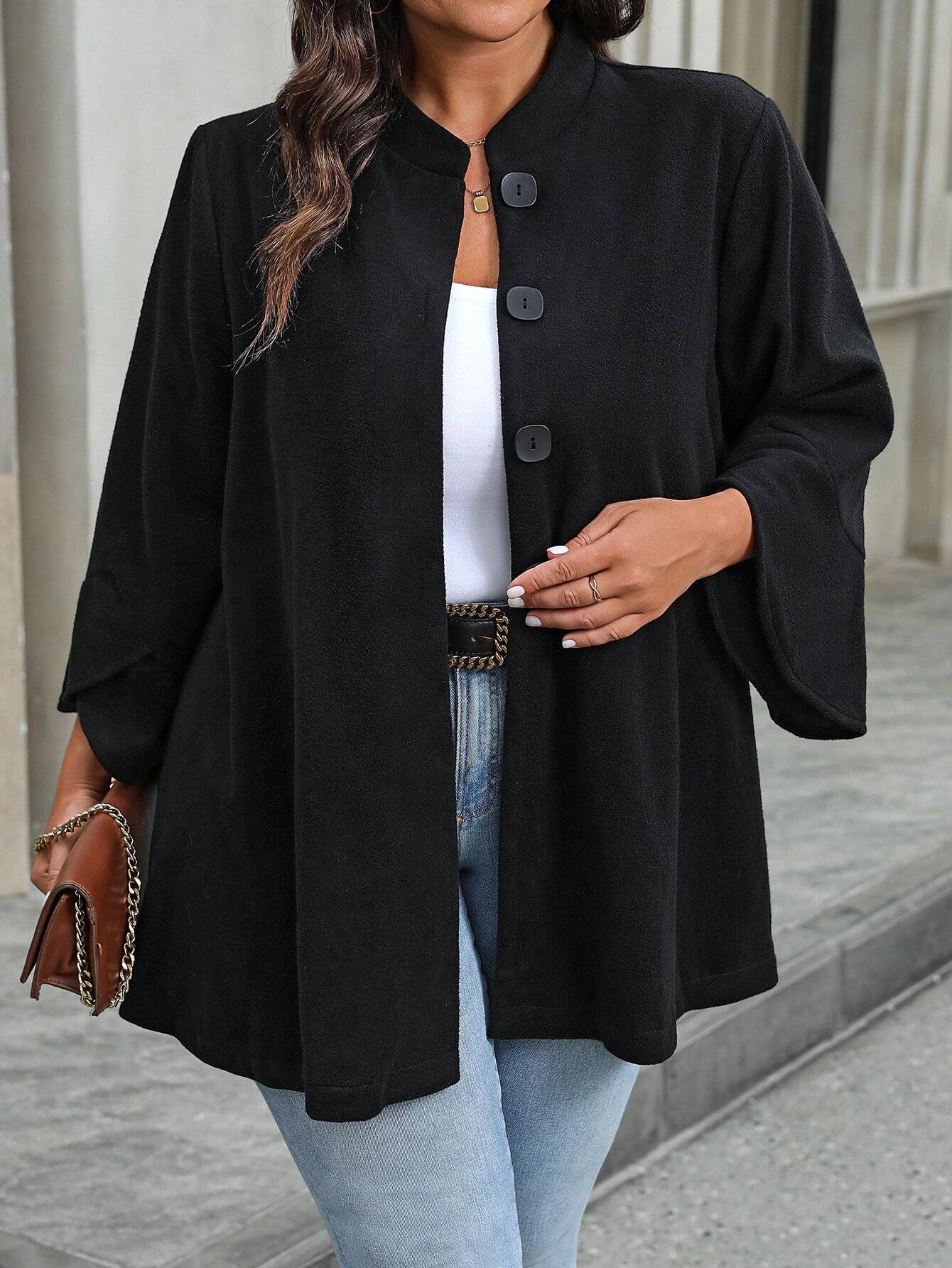 Cappotto midi da donna in maglia di lana nera con colletto alto, maniche 3/4 e bottoni decorativi
