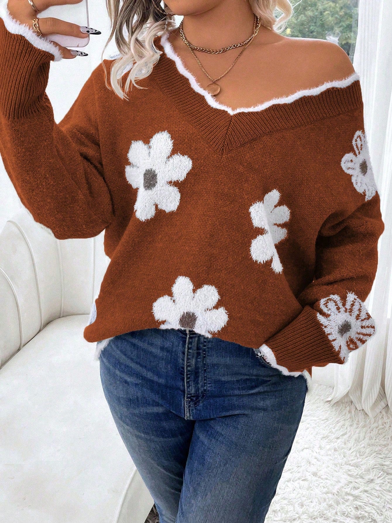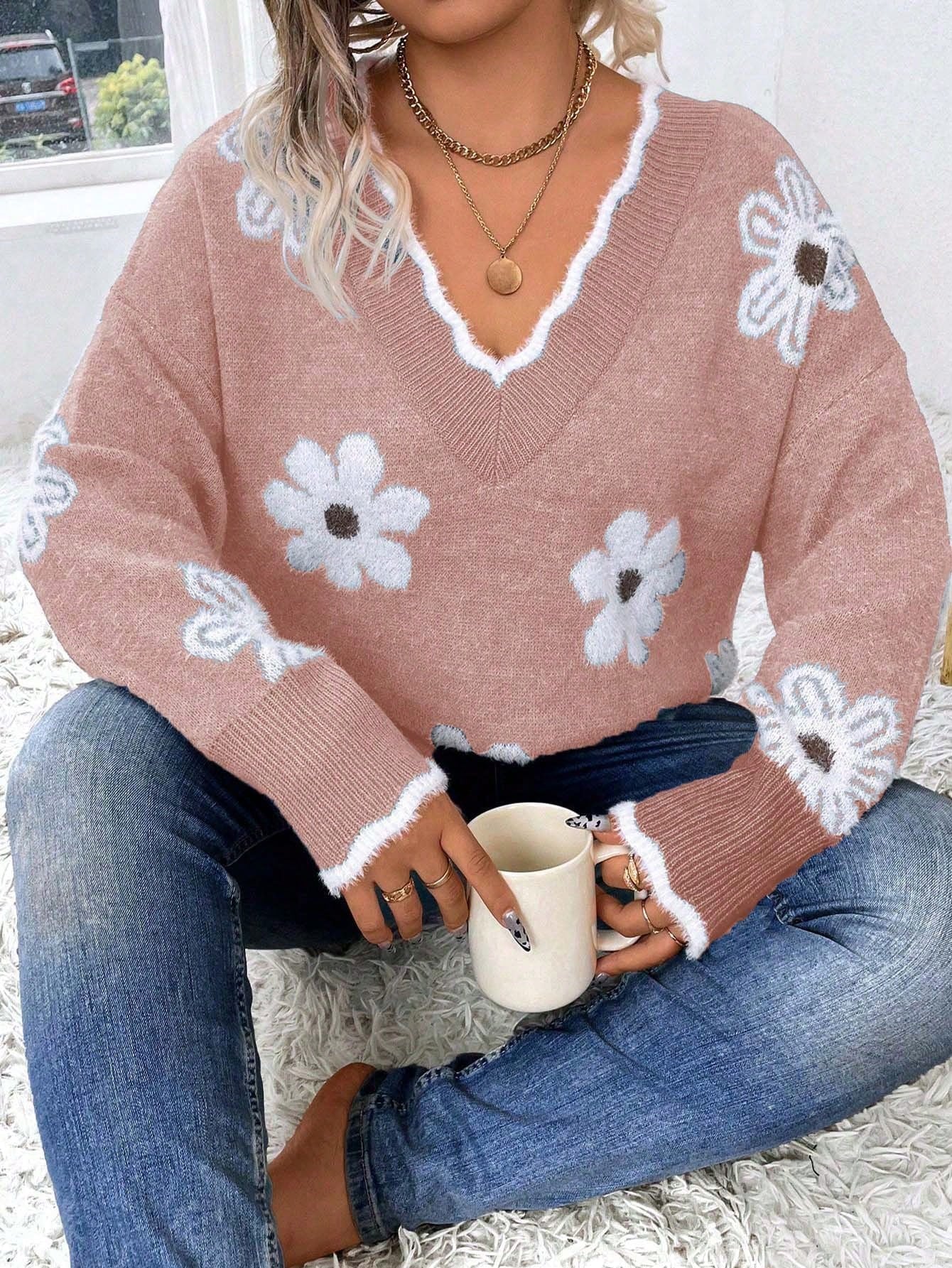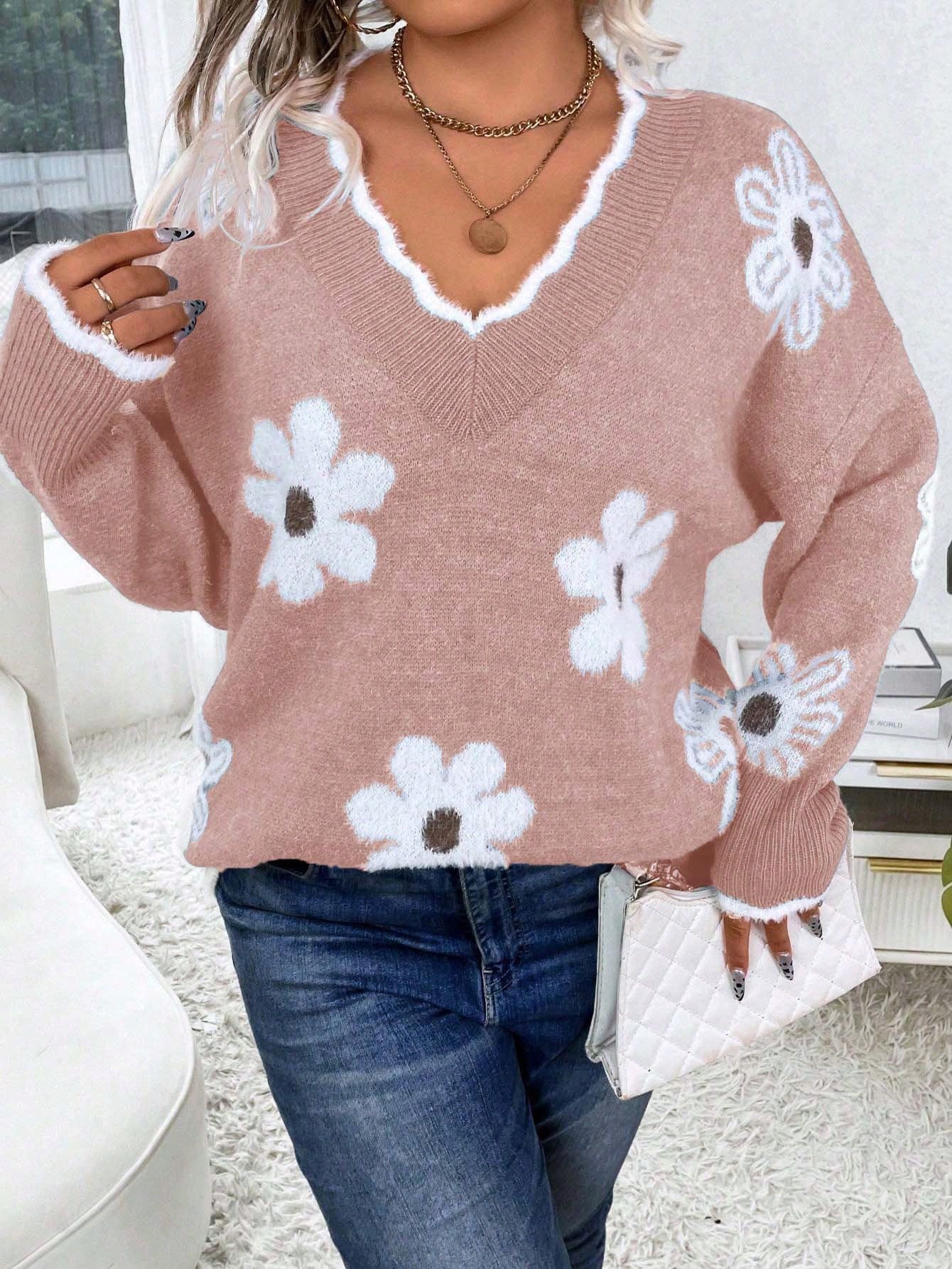 Maglione casual oversize da donna con maniche a giro e motivo floreale, adatto per l'autunno/inverno