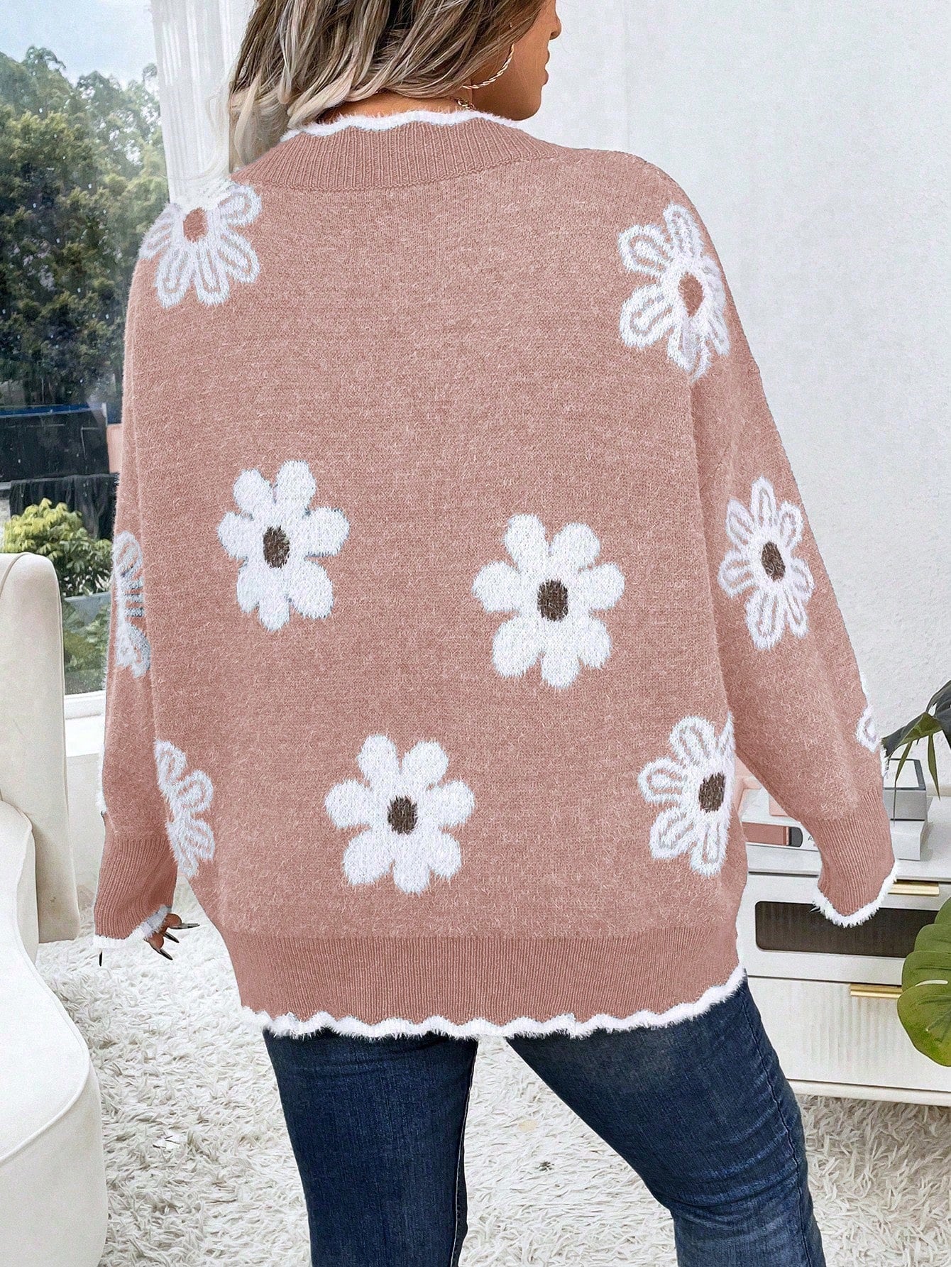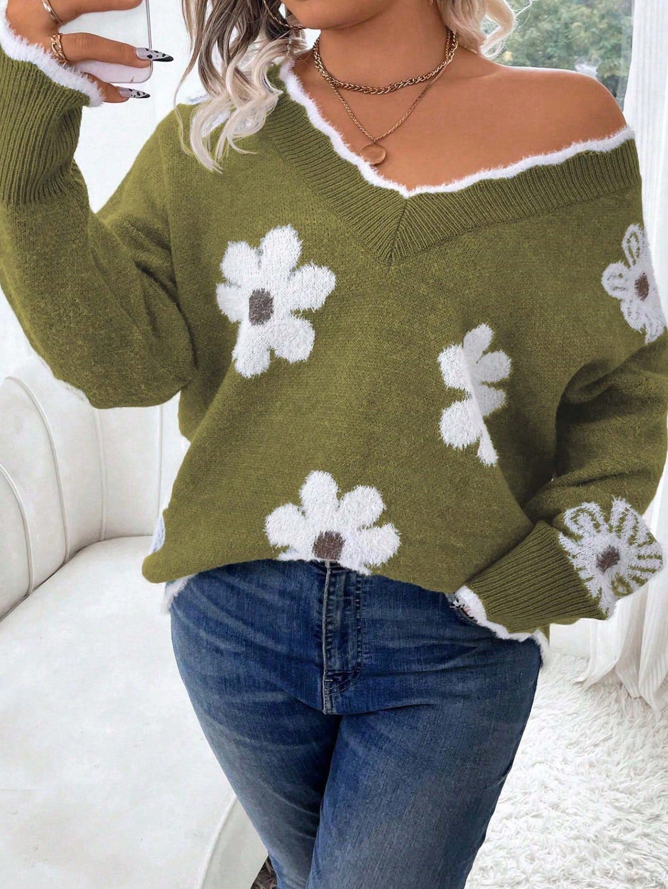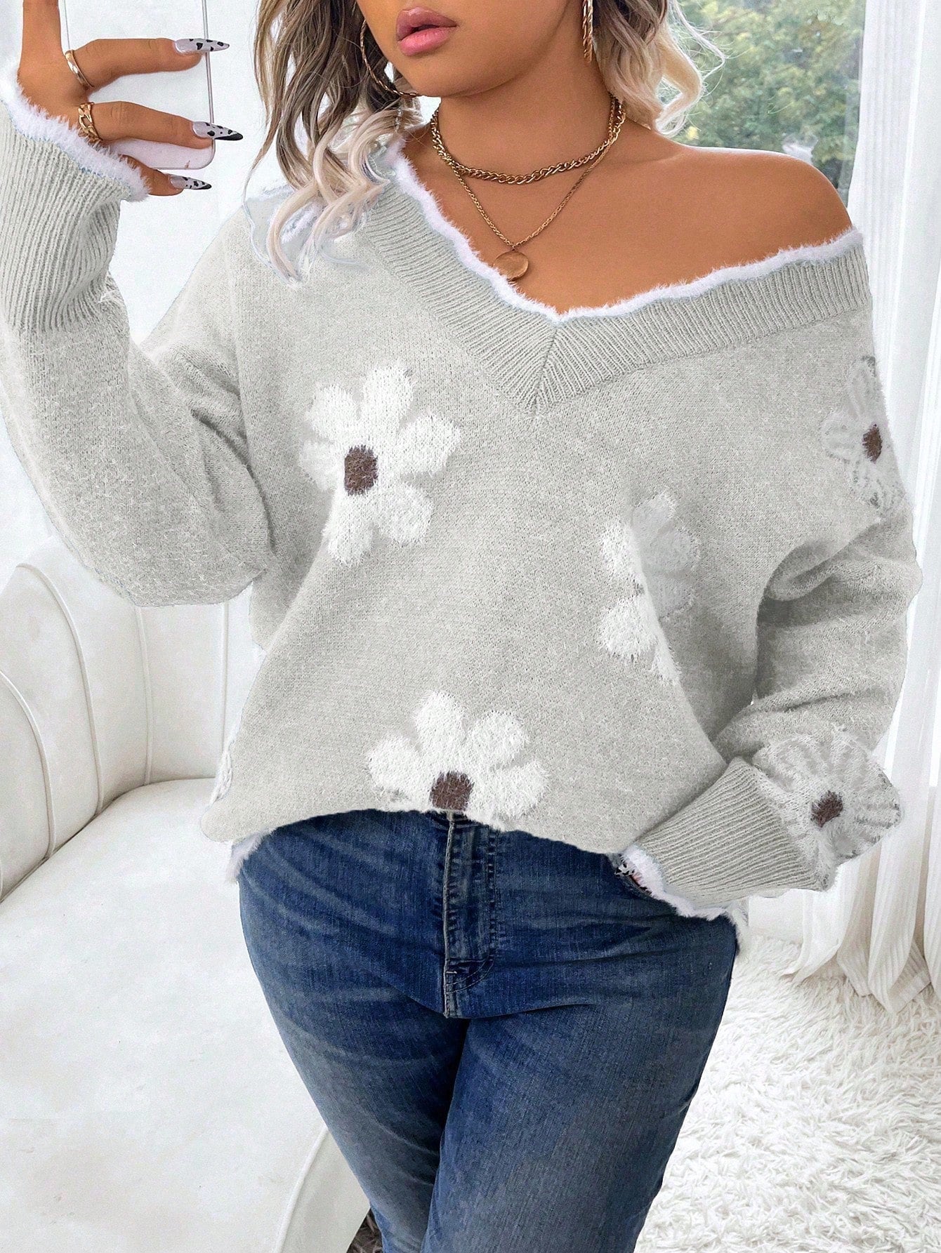 Maglione casual oversize da donna con maniche a giro e motivo floreale, adatto per l'autunno/inverno