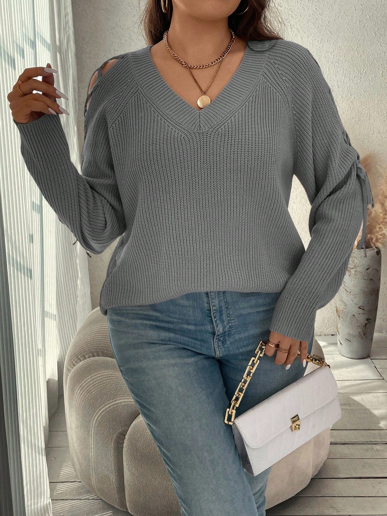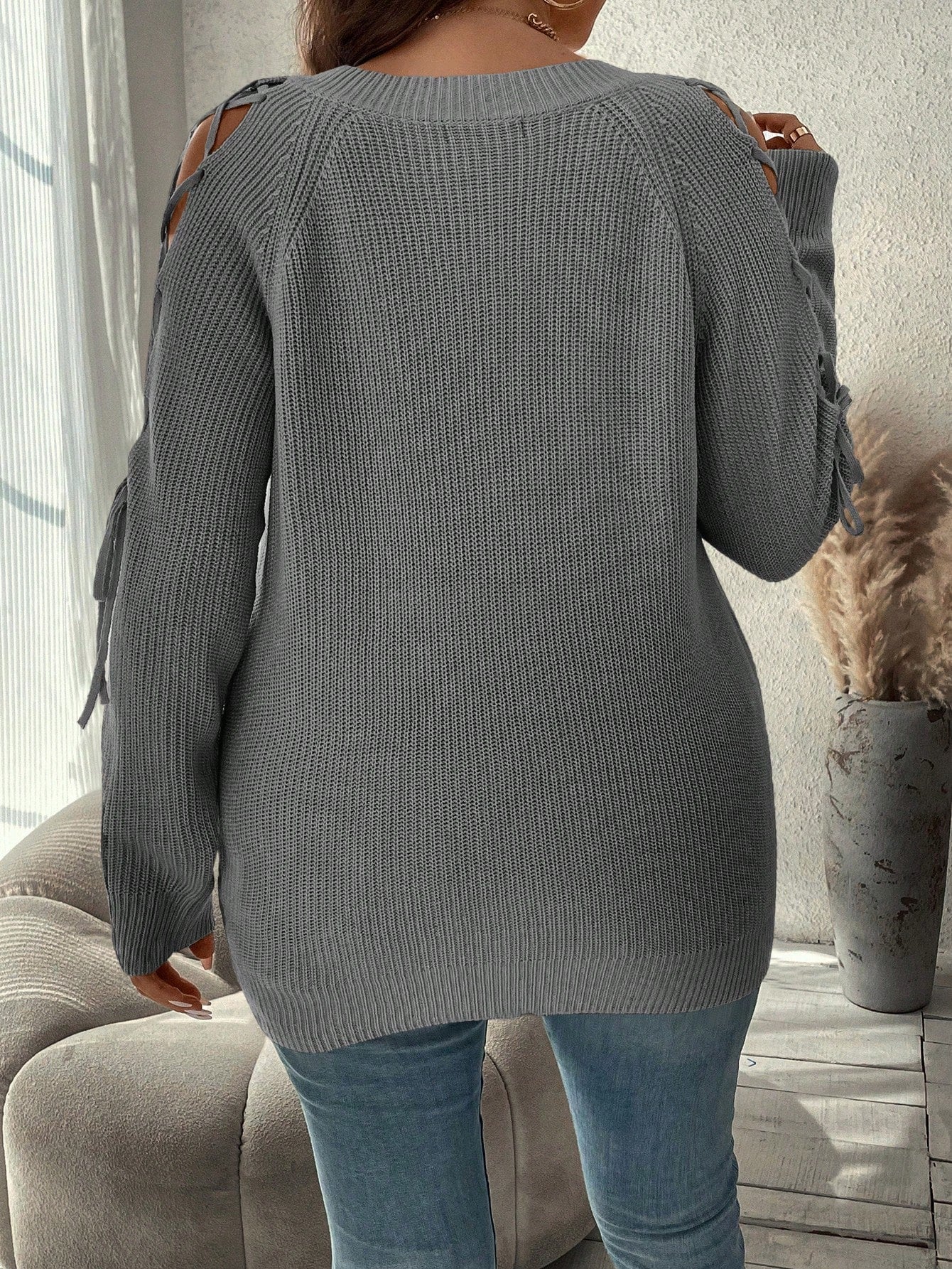 Maglione oversize da donna con maniche a raglan e laccetti