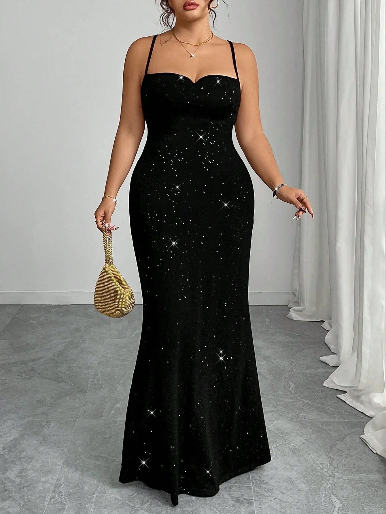Abito elegante , con spalline a spaghetti e schiena scoperta, con paillettes, per taglie comode