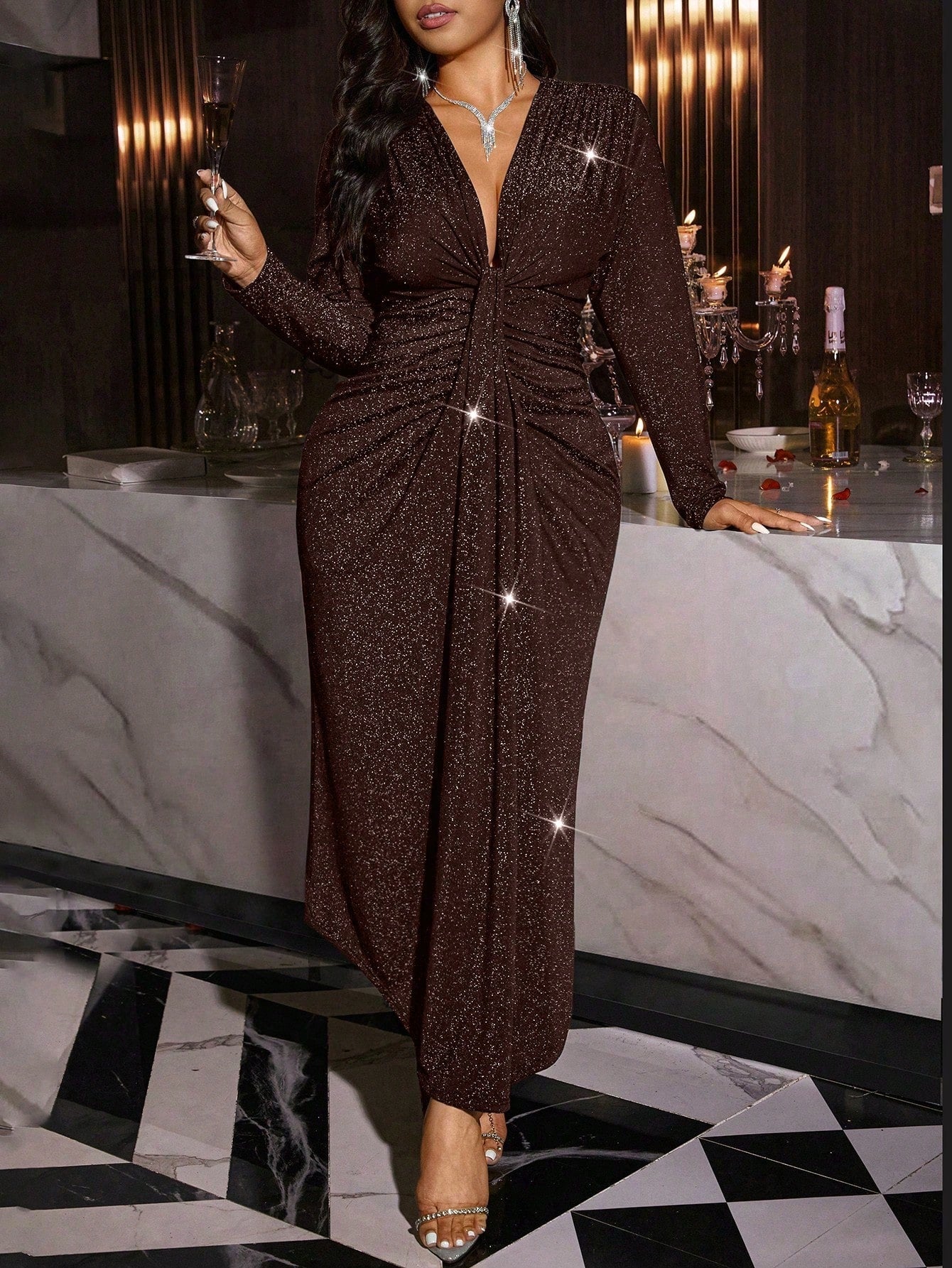 Abito elegante e versatile con vita arricciata, collo basso e alla moda, taglie comode