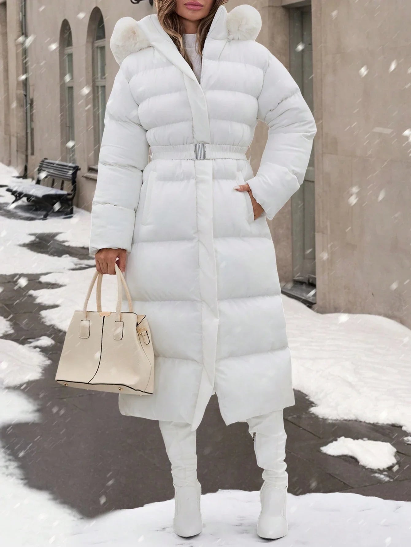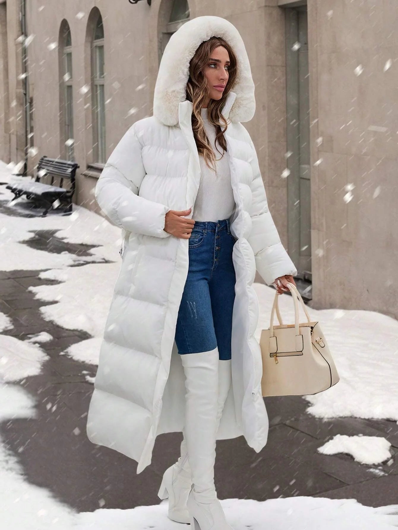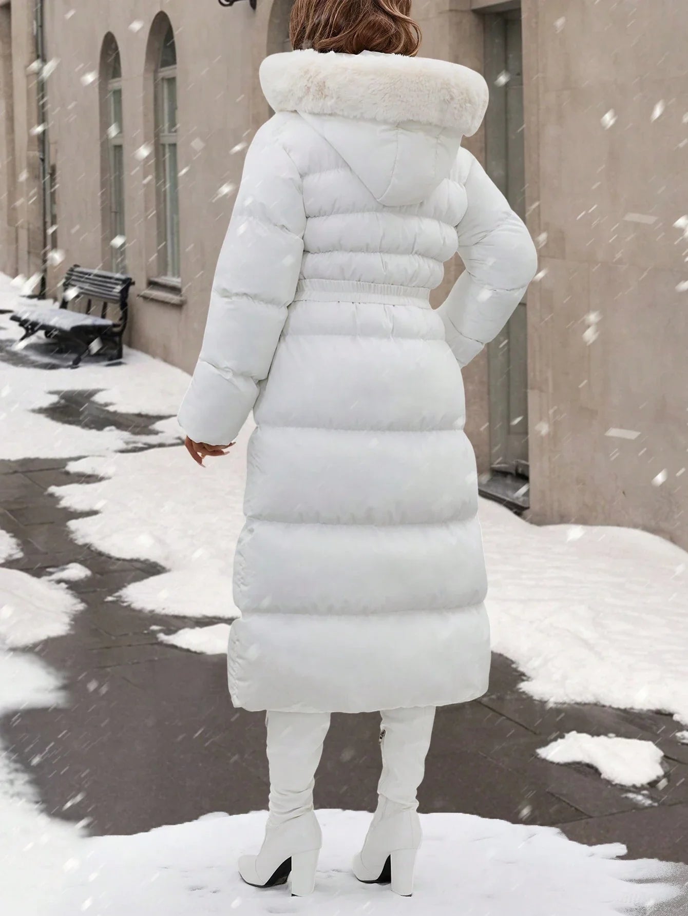 Cappotto con colletto in pelliccia, dettagli con cintura, lunghezza maxi, molto caldo ed elegante
