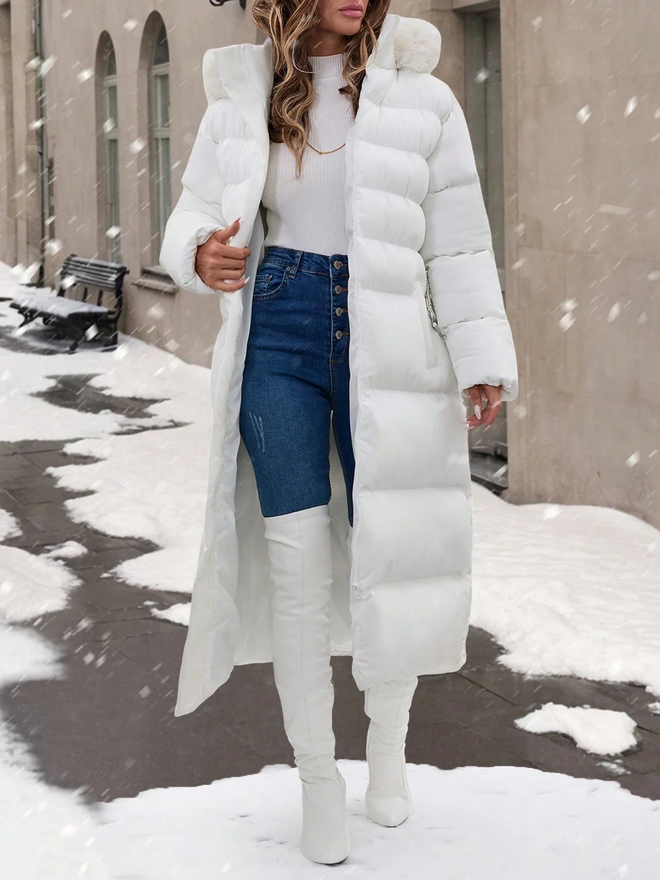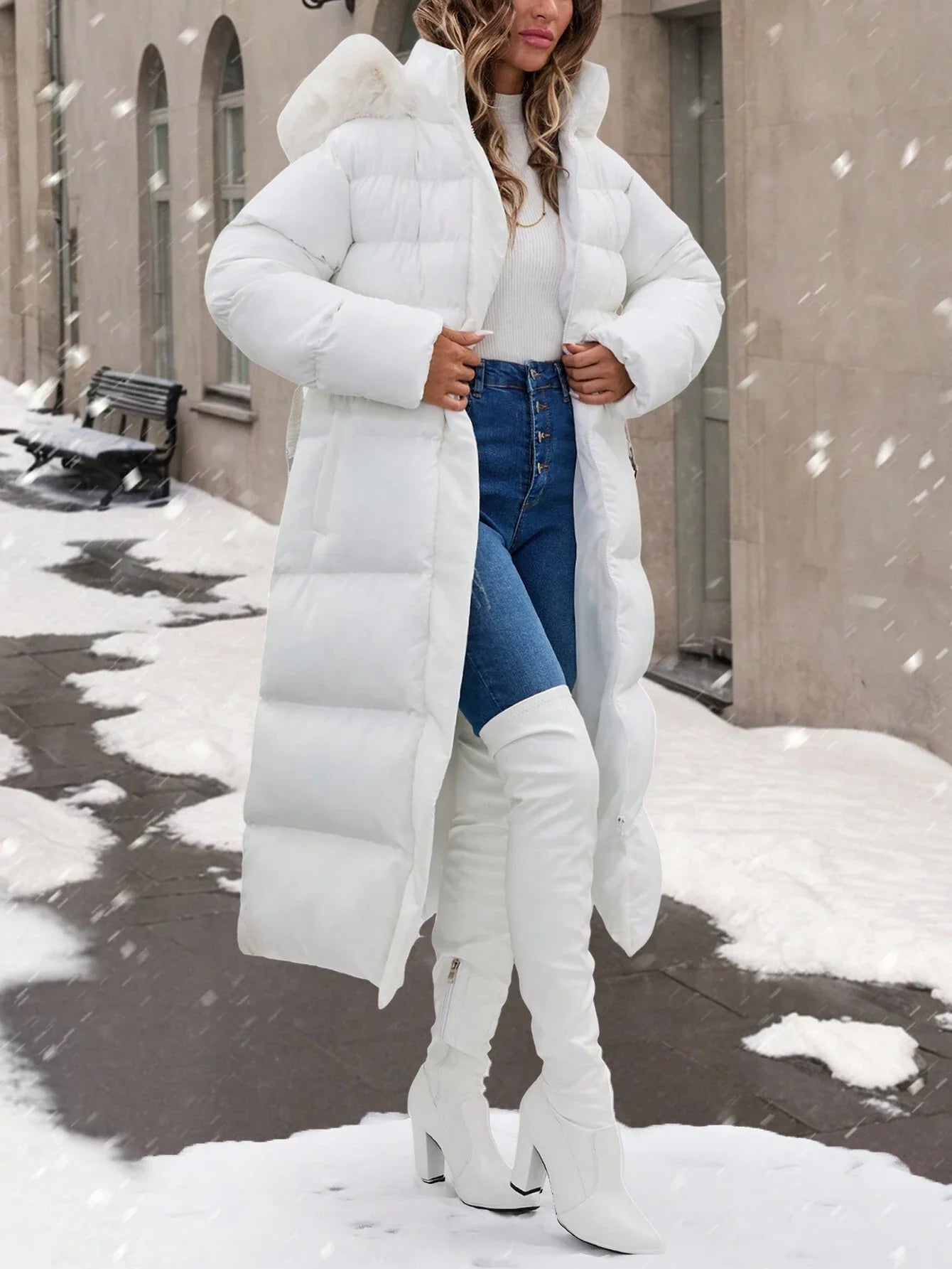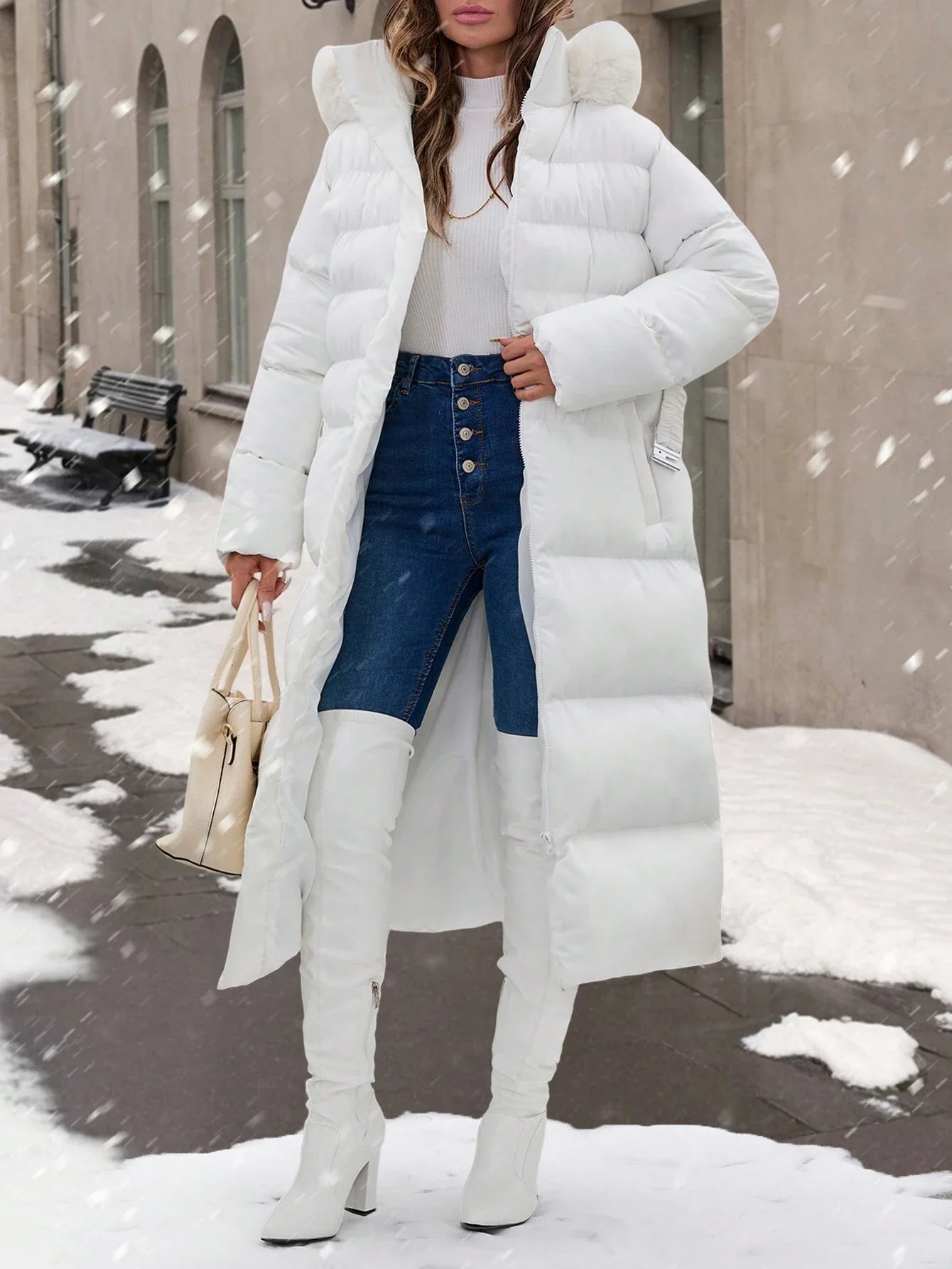 Cappotto con colletto in pelliccia, dettagli con cintura, lunghezza maxi, molto caldo ed elegante