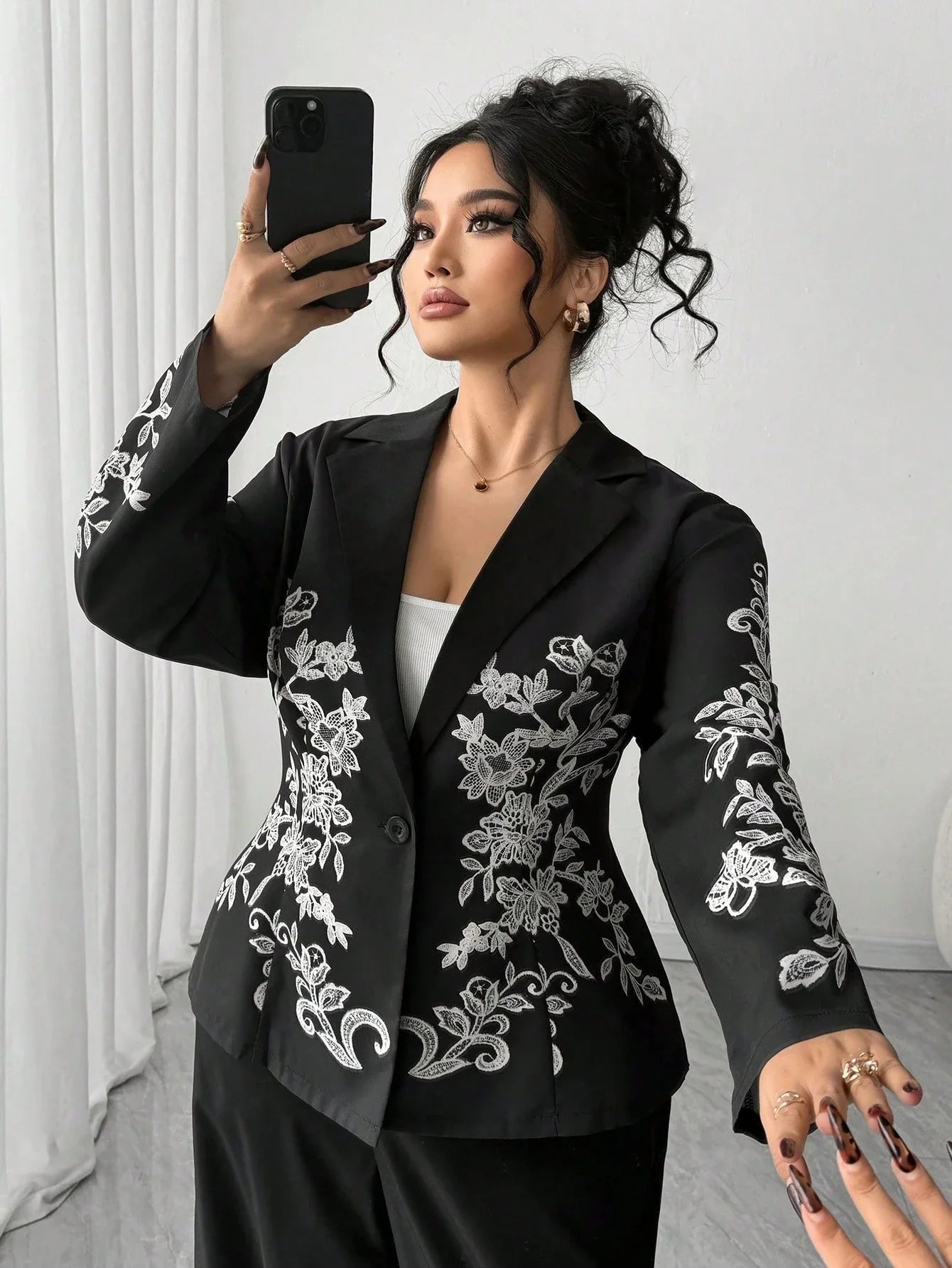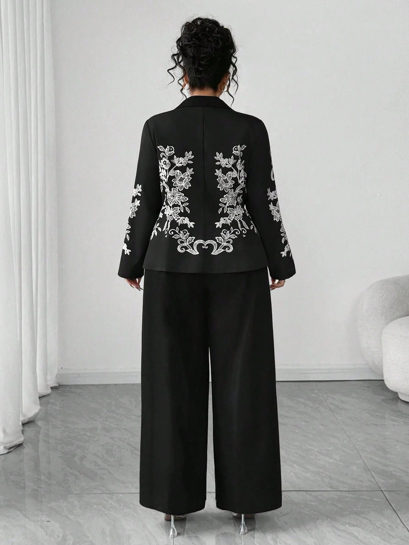 Completo giacca e pantaloni della nuova stagione, con blazer a maniche lunghe, colletto, vita stretta e stampa