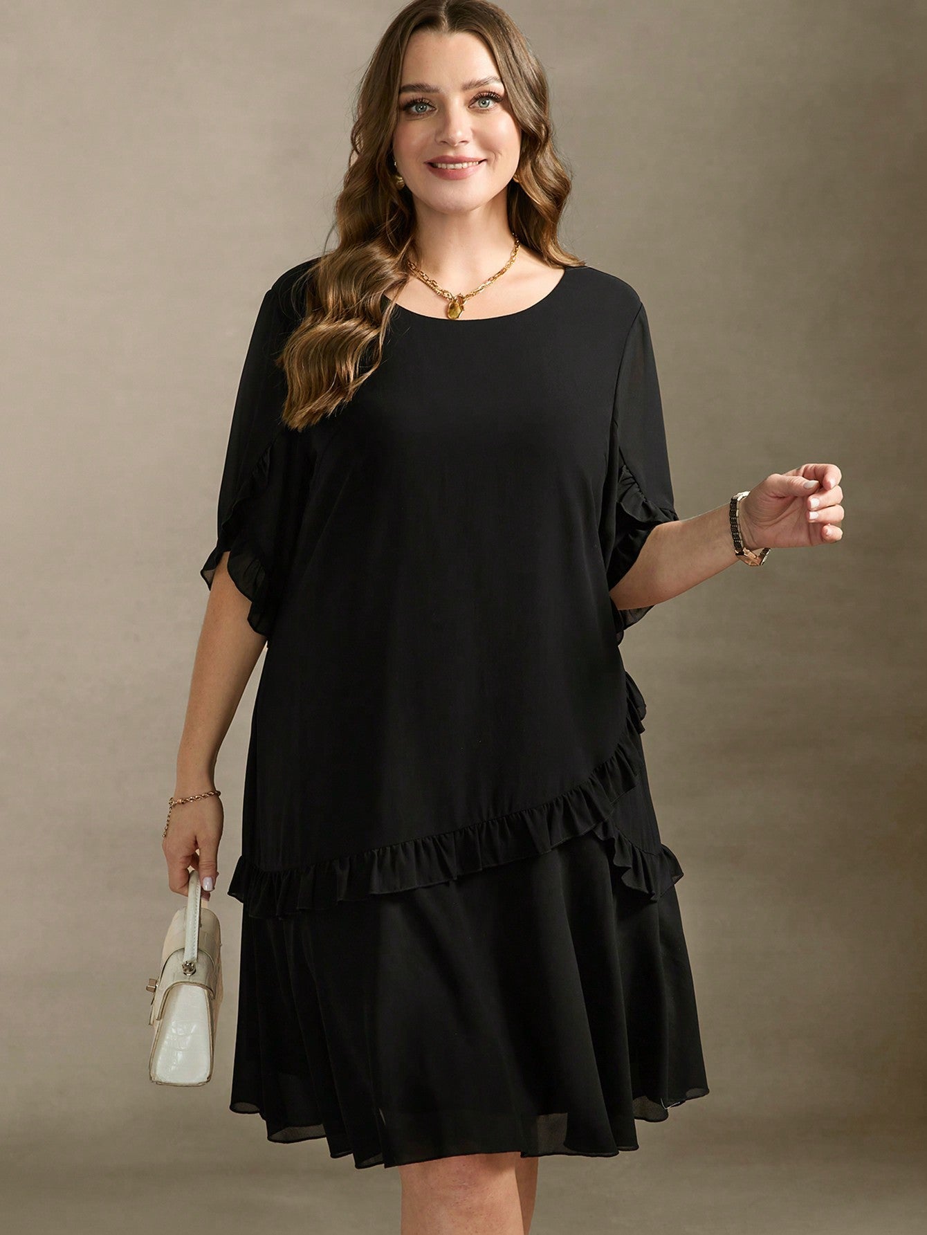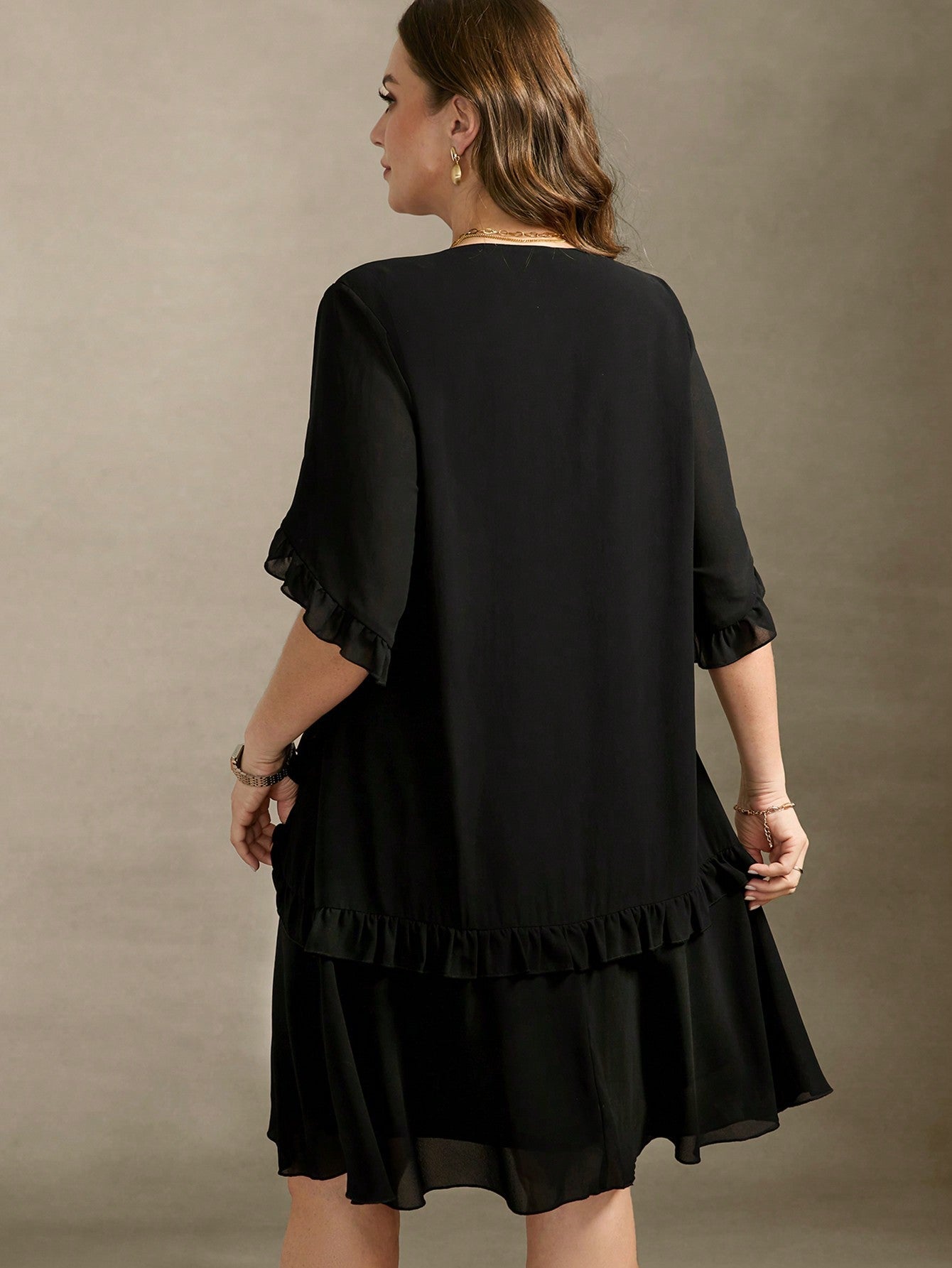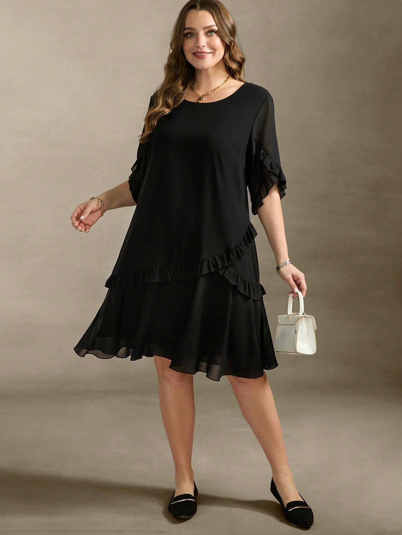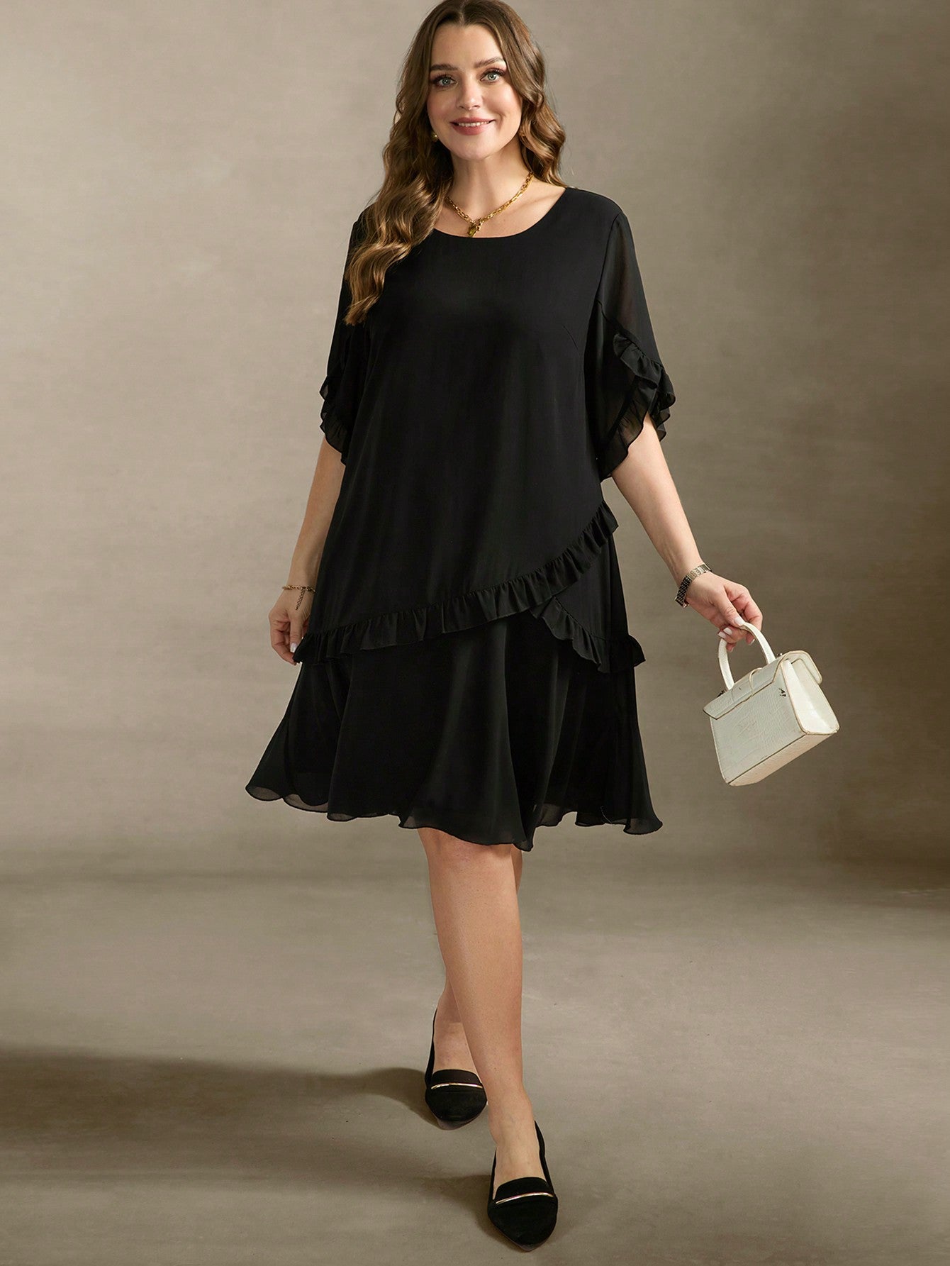 Vestito elegante nero con volant, a vita alta, in chiffon, con taglio a balze
